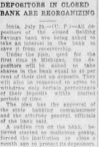 DEPOSITORS IN CLOSED BANK ARE REORGANIZING positors of the closed Belding Savings bank are being asked to take an Interest in the bank to save from receivership Under the plan, used for the first time in Michigan the de positors will he asked to take shares in the bank equal to 40 per also be requested to agree to withdraw only certain percentages of their deposits within limited periods time The plan has the approval of the state banking commissioner and the attorney officials of the bank said A sudden run on the bank. be forced the institution to close month ago to protect its depositors
