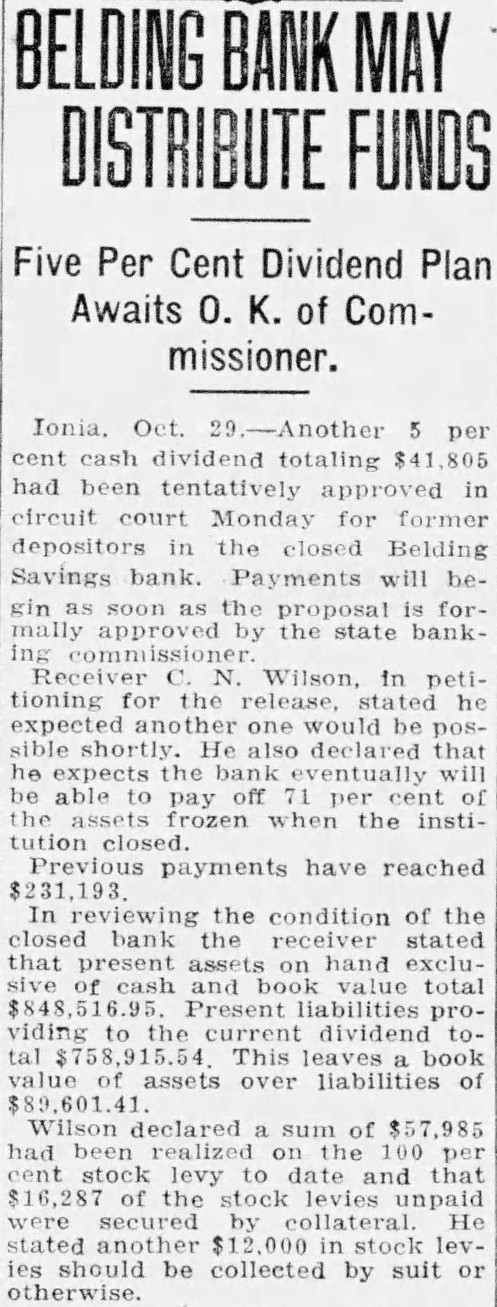 BELDING BANK DISTRIBUTE FUNDS Five Per Cent Dividend Plan Awaits 0. K. of Commissioner. Ionia. Oct. dividend 805 had been tentatively approved in circuit court Monday for former depositors closed Belding Savings bank. Payments will besoon the proposal formally approved the state bankWilson, in petitioning for the he be also that he expects the will able pay off assets frozen when the instipayments have reached In the condition of the closed bank stated that present hand excluof cash and book value Present tal This value assets liabilities of Wilson declared sum of had been realized the 100 levy and the were collateral stated stock levies should be collected by suit or otherwise.