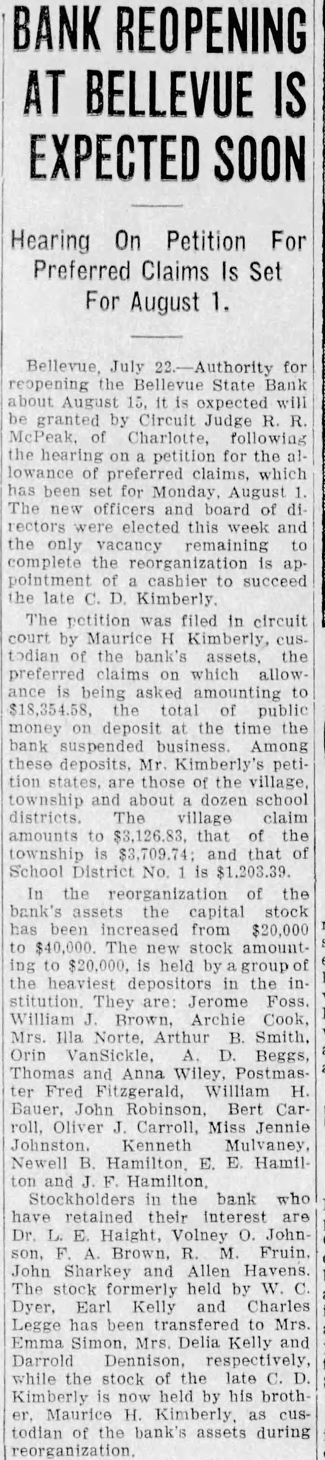 BANK REOPENING AT BELLEVUE IS EXPECTED SOON Hearing On Petition For Preferred Claims Is Set For August Bellevue, July for reopening the Bellevue State Bank about August expected will be granted by Circuit Judge R. McPeak. Charlotte, following the hearing on petition for the lowance preferred claims. which has been set for Monday August The and board rectors were elected this week and the vacancy remaining complete the reorganization appointment cashier to succeed the late Kimberly. The potition was filed in circuit court by Kimberly, todian of the bank's assets, the claims on which allowbeing asked amounting to total of public money deposit at the time the bank suspended Among these deposits, Mr. Kimberly's petistates, are those of the village, township about dozen school districts. The village claim amounts to that of the township is $3,709.74: that of School District No. $1,203.39. the reorganization of the bank's assets capital stock has been increased from $20,000 $40,000 The stock amountheld the depositors the in stitution They Jerome Foss. William Archie Cook, Mrs. Illa Arthur B. Orin VanSickle, D. Beggs, Thomas Anna Wiley, Postmaster Fred Fitzgerald, William H. Bauer, John Robinson, Bert Car roll, Oliver Carroll, Miss Jennie Johnston. Kenneth Mulvaney, Newell B. Hamilton E. E. Hamil and Stockholders in the bank who have retained their are Dr. Haight, Volney O. John Brown, John Sharkey and Allen Havens. The stock formerly held by W. Dyer. Earl Kelly and Charles Legge has transfered to Mrs. Emma Simon, Mrs. Delia Kelly and Darrold Dennison, respectively while the stock of the late Kimberly held by his broth Maurice Kimberly. todian of the assets during