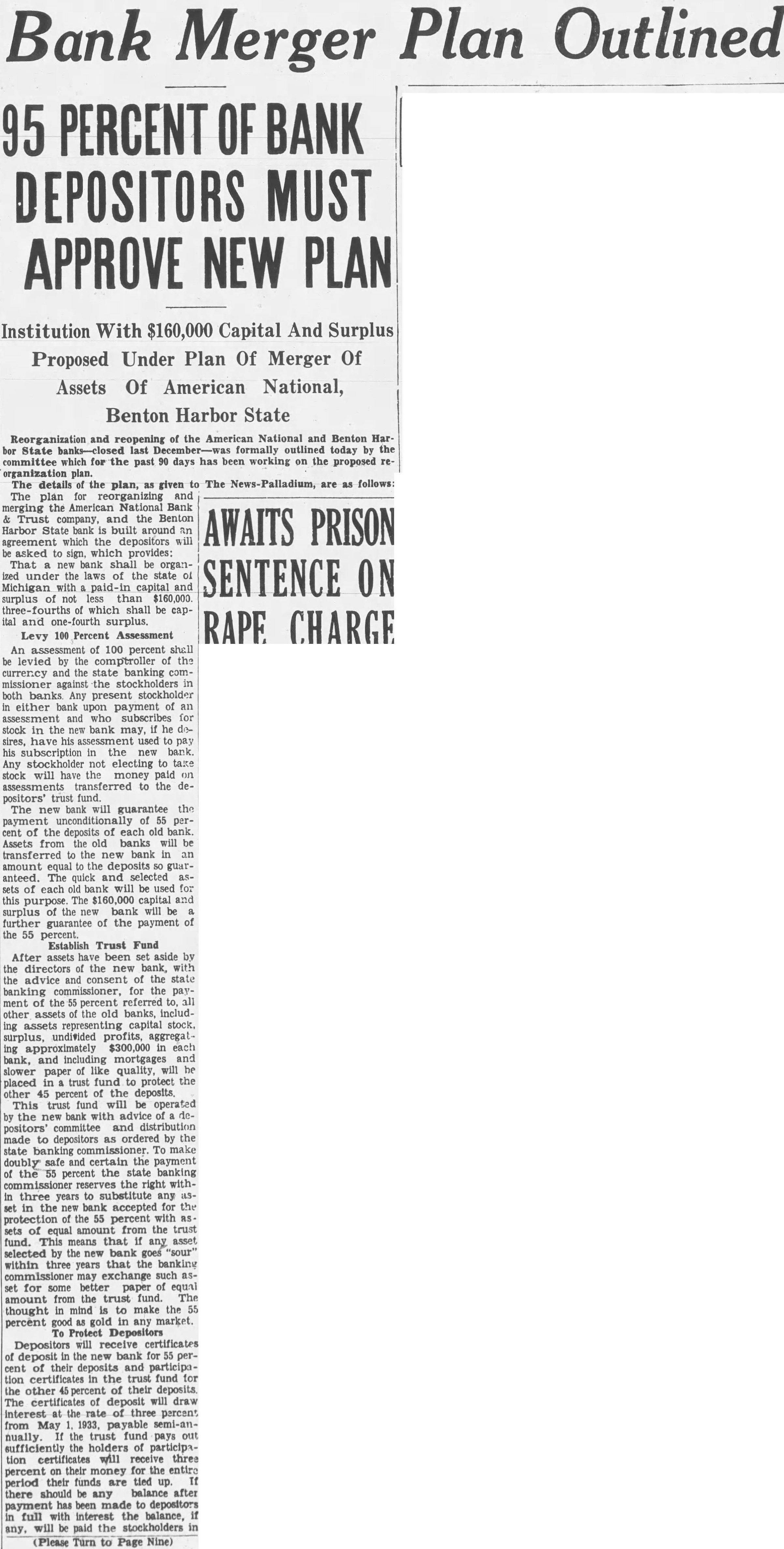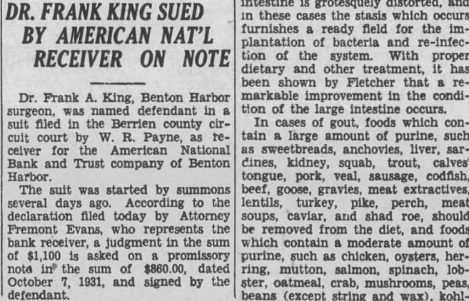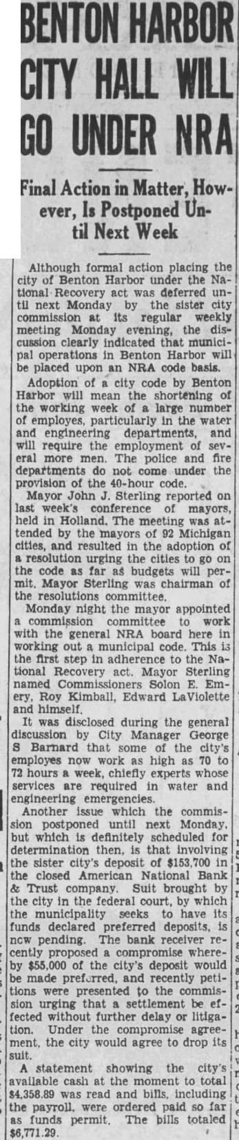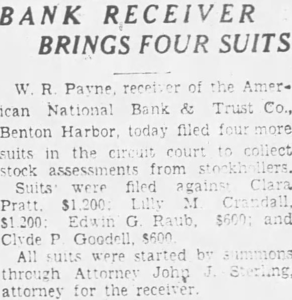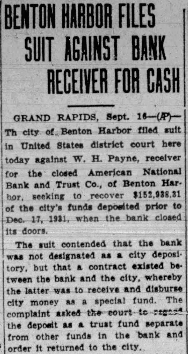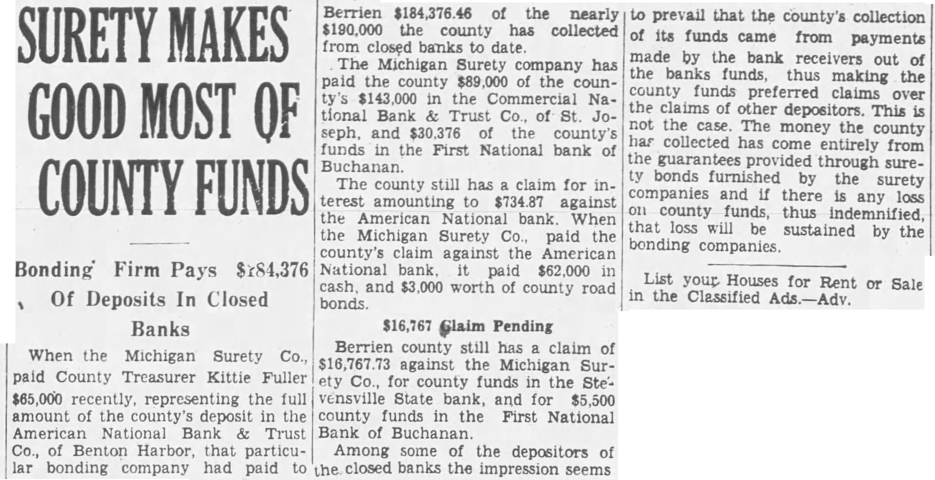 Hennes, Chairman Judiciary Committee, Benton Harbor, Michigan. Supplemental report on County funds in closed banks. Since giving you the report on funds in the closed banks, we have to make the following supplemental report American National Bank and Trust Company, Benton Harbor, Michigan. The County Treasurer filed a claim against the American National Bank and Trust Company for principal and interest lowing: amounting to $66,734.87. This amount was paid in manner folCredit by three Berrien County road bonds, each for $1,000.00 $ 3,000.00 Cash paid by Michigan Surety Company 62,000.00 Total paid $65,000.00 Balance owing by the bank on which amount dividends will be paid to the County, 1,734.87