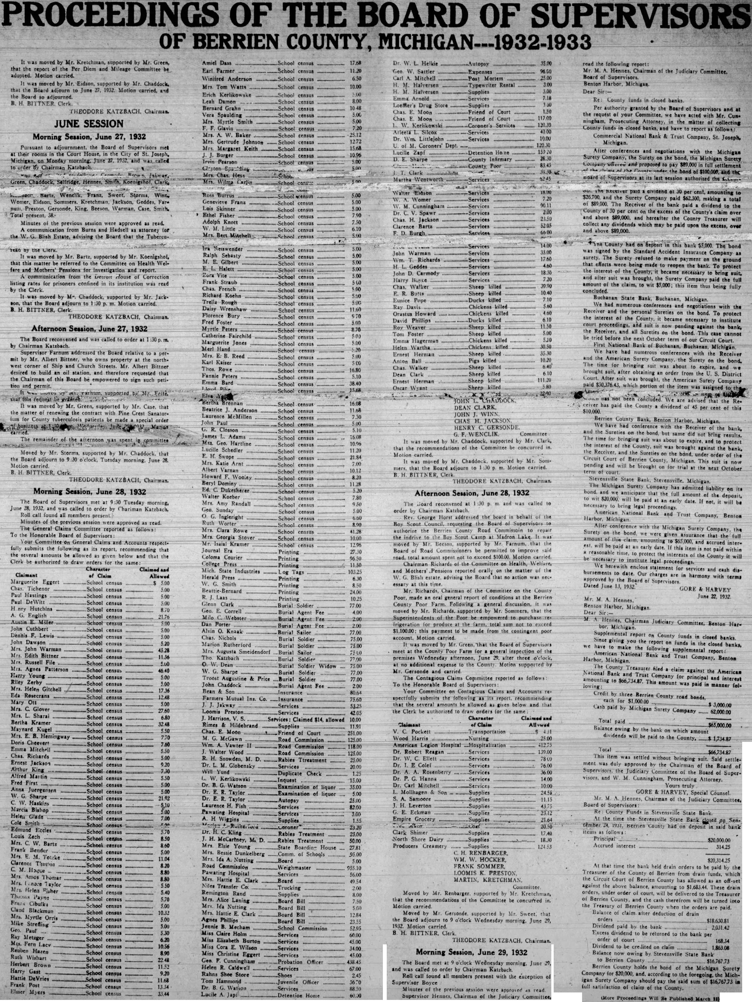 The Board of Supervisors met at 9:30 Tuesday morning, June 28. 1932, and was called to order by Chariman Katzbach. Roll call found all members present. Minutes of the previous session were approved as read. The General Claims Committee reported as follows: To the Honorable Board of Supervisors: Your Committee on General Claims and Accounts respectfully submits the following as its report, recommending that the several amounts be allowed as given below and that the Clerk be authorized to draw orders for the same: Character Claimed and Claimant of Claim Allowed Marguerite Eggert School census 5.00 Chas. Tichenor School census 5.00 Paul Hastings School census 5.00 Paul DeWitt School census 5.00 H nry Hutchins School census 8.70 A. G. English School census 21.76 Austin Miller School census 5.00 John Cuthbert School census 5.00 Dennis F. Lewis School census 5.00 John Dawson School census 5.20 Mrs. John Warman School census 45.28 Mrs. Edith Bittner School census 11.36 Mrs. Russell File School census 5.00 Mrs. Agnes Patterson School census 46.40 Harry Young School census 5.00 Riley Zerby School census 5.00 Mrs. Helen Gitchell School census 17.36 Eda Resecrans School census 12.48 Mary Ott School census 5.00 Mrs. C. Glover School census 27.60 Mrs. Sharai School census 6.80 Bertha Kramer School census 32.48 Maynard Kugel School census 5.50 Mrs. E. B. Hemingway School 7.70 census Doris Cheevert School census 7.60 Emma Mitchell School census 5.50 Chas. Richards School census 5.00 Ernest Jackson School census 9.20 Arthur King School census 7.30 Alfred Martin School census 5.50 Fred First School census 5.00 Anna Juergensen School census 5.00 W. G. Sharpe School census 21.92 C. W. Haskins School census 5.10 Marcia Bishop School census 5.00 Helen Glade School census 7.00 Cole Smith School ceasus Edmund Eccles School census 5.70 Louis Zech School census 8.50 Mrs. W. Bartz School census 8.60 Frank Bender School census 5.00 Mrs. E. M. Totake School census 11.04 School census 8.20 C. M. Hogue School census 8.80 Mrs. Amos Thomas School census 8.80 Mrs. Linore Taylor School census 5.50 Mrs. Helen Floher School census 5.40 Thomas Payne School census 5.70 Frank Cibulka School census 5.00 Claud Blackmun School census 10.32 Mrs. Myrtle Orris School census 5.00 Mike Strefling School census 5.00 Geo. Paul School census 5.30 Ray Metzger School census 6.20 Mrs. Fern Lacv School census 10.56 Reuben Hazen School census 8.90 Ruth Wishart School census 22.48 Herbert Brown School census 11.52 Harry Gast School census 9.20 Hattie DeVries School census 11.68 Frank Post School census 13.34 Elmer Myers School census 33.44