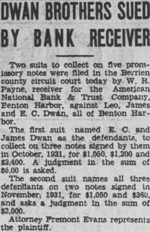 County had on deposit in this bank $5,000. The bond was signed by the Standard Accident Insurance Company as surety. The Surety refused to make payment on the ground that efforts were being made to reopen the bank. To protect the interest of the County, it became necessary to bring suit, and after suit was brought, the Surety Company paid the full amount of the claim, to wit $5,000; this item thus being fully concluded. Buchanan State Bank, Buchanan, Michigan. We had numerous conferences and negotiations with the Receiver and the personal Sureties on the bond. To protect the interest of the County, it became necessary to institute court proceedings, and suit is now pending against the bank, the Receiver, and all Sureties on the bond. This case cannot be tried before the next October term of our Circuit Court. First National Bank of Buchanan, Buchanan, Michigan. We have had numerous conferences with the Receiver and the American Surety Company, the Surety on the bond. The time for bringing suit was about to expire, and we brought suit, after obtaining an order from the U. S. District Court. After suit was brought, the American Surety Company paid $30,376.43. which portion of the item was assigned to not been We are advised that the Re$10,000. ceiver has paid the County dividend of 45 per cent of this Berrien County Bank, Benton Harbor, Michigan. We have had conference with the Receiver of the bank, and the Sureties on the bond. but same did not bring results. The time for bringing suit was about to expire, and to protect the interest of the County, suit was brought against the bank, the Receiver, and the Sureties on the bond. under order of the Circuit Court of Berrien County, Michigan. This suit is now pending and will be brought on for trial at the next October term of court. Stevensville State Bank, Stevensville. Michigan. The Michigan Surety Company has admitted liability on its bond. and we anticipate that the full amount of the deposit, to wit $20,000 will be paid at an early date. If not, it will be necessary to bring legal proceedings. American National Bank and Trust Company, Benton Harbor. Michigan After conference with the Michigan Surety Company, the Surety on the bond. we were given assurance that the full amount of this claim. amounting to $65,000, and accrued interest. will be paid at an early date. If this item is not paid within reasonable time, to protect the interests of the County it will be necessary to institute legal proceedings. We herewith enclose statement for services and cash disbursements to date. Our charges are in harmony with terms approved by the Board of Supervisors. Dated June 13, 1932. GORE & HARVEY June 22, 1932. Mr. M A. Hennes.