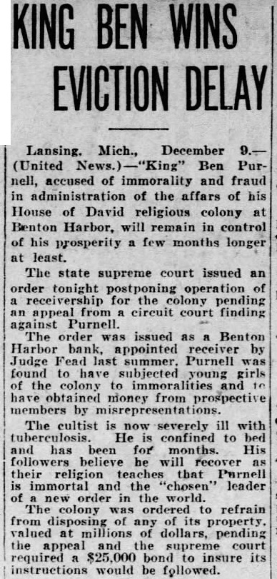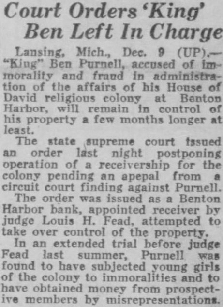 Court Orders Ben Left In Charge Lansing, Mich., Dec. Ben Purnell, accused of morality and fraud administration of his House David colony Benton Harbor, property few months longer The state supreme court Issued an order last night postponing operation of the colony pending an apepal from circuit court finding against Purnell. The order was issued Benton Harbor bank, receiver judge Louis H. Fead, attempted control of the property. extended trial before judge Fead summer, Purnell found to subjected young girls the to obtained from prospectmembers by