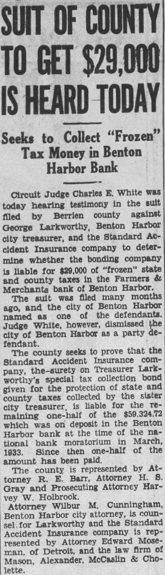 AMERICAN NAT'L BANK DIVIDEND SOON IS HINTED Depositors in B. H. Bank May Get Payment Before Holidays When W. Payne winds up the details of his work as tor for the old Farmers and Merchants bank in Benton Harbor in day he's going to turn his couple dividend distributions for the benefit of more bank depositors. ten per cent dividend is in prospect for the of the American National of Benton Harbor, and similar distribution in prospect the depositors of the Buchanan Mr. Payne, as receiver, having charge both trusts. Expected Before Holidays It's expected that the two dividends will be before the holidays, although Mr. Payne will hazard no guess as the got to get all through with this job (referring to the M. before turn my attention to other matters," he said today. However, it is known the ten per cent dividend for the American tional depositors, who have already had 35 per cent, has been in prospect for some time. of the sister city's preferred claim against the American recent transaction, has hurried along the chances another American National With his duties over as the conservator, Payne goes back receivership duties in Joseph, Benton Harbor and He the only national bank receiver the state who has three trusts While he was in charge of the hired R. formerly trust officer of the American National later with the Benton Harbor State, to take charge of the Buchanan trust. recently landed job with the federal land bank at Paul and has gone there, while his place has been filled at Buchanan L. Gose, of Denver, Colo. The costs of the conservatorship of the under Payne, will be borne by the old bank. The retiring conservator says this operating cost will be amply sustained by the earnings of the M. while was closed, interest other earnings going on even though the bank was practically standstill outside of its trust business. Thus the cost of the not have come out of assets which Payne turns over to the trust committee for liquidation for the benefit of the old M. depositors.