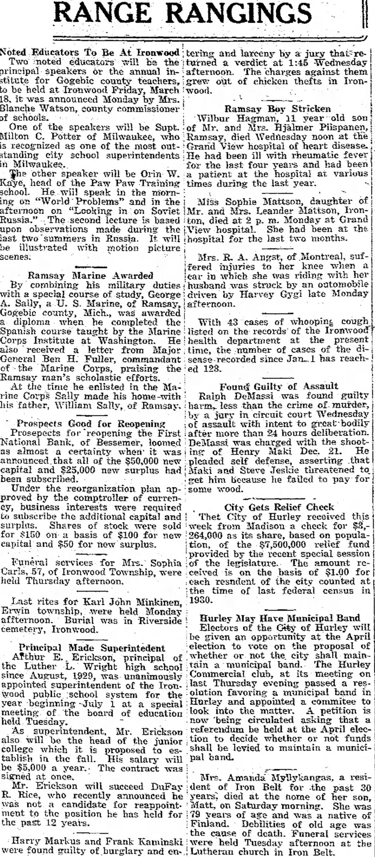 RANGE RANGINGS Noted Educators To Be At Ironwood Two noted educators will be the principal speakers or the annual institute for Gogebic county teachers, to be held at Ironwood Friday, March it was announced Monday by Mrs. Blanche Watson, county commissioner of schools. One of the speakers will be Supt. Milton Potter of Milwaukee, who is recognized as one of the most outstanding city school superintendents in Milwaukee. other speaker will be Orin W. Kaye, head of the Paw Paw Training school. He will speak in the morning on "World Problems" and in the afternoon on "Looking in on Soviet Russia." The second lecture is based upon observations made during the last two summers in Russia. It will be illustrated with motion picture scenes. Ramsay Marine Awarded By combining his military duties with special course of study, George A. Sally, Marine, of Ramsay, Gogebic county, Mich., was awarded diploma when he completed the Spanish course taught by the Marine Corps Institute at Washington. He also received letter from Major General Ben H. Fuller, commandant the Marine Corps, praising the Ramsay man's scholastic efforts. At the time he enlisted in the Marine Corps Sally made his his father, William Sally, of Ramsay. Prospects Good for Reopening Prosepects for reopening the First National Bank, of Bessemer, loomed as almost certainty when was announced that all of the $50,000 new capital and $25,000 new surplus had been subscribed. Under the reorganization plan approved by the comptroller of currency, business interests were required subscribe the additional capital and surplus. Shares of stock were sold for $150 on basis of $100 for new capital and $50 for new surplus. Funeral services for Mrs. Sophia Carls, 57, of Ironwood Township, were held Thursday afternoon. Last rites for Karl John Minkinen, Erwin township, were held Monday affternoon. Burial was in Riverside cemetery, Ironwood. Principal Made Superintedent Arthur E. Erickson, principal of the Luther L. Wright high school since August, 1929, was unanimously appointed of the Ironwood public school system for the year beginning July at special meeting of the board of education held Tuesday. As superintendent, Mr. Erickson also will be the head of the junior college which is proposed to tablish in the fall. His salary will be $5,000 year. The contract was signed once. Mr. Erickson will succeed DuFay R. Rice, who recently announced he was not candidate for reappointment to the position he has held for the past 12 years. Harry Markus and Frank Kaminski were found guilty of burglary and en- tering and by jury turned verdict at Wednesday afternoon. The charges against them grew out of chicken thefts in Ironwood. Ramsay Boy Stricken Wilbur Hagman, 11 year old son of Mr. and Mrs. Hjälmer Piispanen, Ramsay, died Wednesday noon at the Grand View hospital of heart disease. He had been ill with rheumatic fever for the last four years and had been at the hospital at various patient times during the last year. Miss Sophie Mattson, daughter of Mr. and Mrs. Leander Matison, Ironton, died at m. Monday at Grand View hospital. She had been at the hospital for the last two months. Mrs. R. A. Angst, of Montreal, suffered injuries to her knee when in which she was riding with her husband was struck by an outomobile driven by Harvey Gygi late Monday afternoon. With 43 cases of whooping cough listed on the records of the Ironwood health department at the present time, the number of cases of the direcorded since has reachsease ed 123. Found Guilty of Assault Raiph DeMassi was found guilty harm. less than the crime of murder, a jury in circuit court Wednesday assault with intent to great after more than 24 hours DeMassi was with the shooting of Henry Maki Dec. 21. He pleaded self defense, asserting that Maki and Steve Jeskie threatened to get him Because he failed to pay for some wood. City Gets Relief Check Thet City of Hurley received this week from Madison check for $3,as its share, based on population, of the relief fund provided by the recent special session of the legislature. The amount received is on the basis of $1.00 for each resndent of the city counted at the time of last federal census in 1930. Hurley May Have Municipal Band Electors of the City of Hurley will be given an opportunity at the April election to vote on the proposal of whether or not the city shall maintain municipal band. The Hurley Commercial club, at its meeting on last Thursday evening passed resolution favoring municipal band in Hurley and appointed a commitee to look into the matter. A petition is now being circulated asking that referendum be held at the April election to decide whether or not funds shall be levied to maintain municipal band. Mrs. resident of Iron Belt for the past 30 years. died at the home of her son, Matt, on Saturday morning. She was years of age and was native of Finland. Debilities of old age was the cause of death. Funeral services were held Tuesday afternoon at the Lutheran church in Iron Belt.