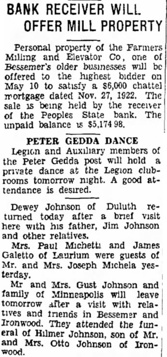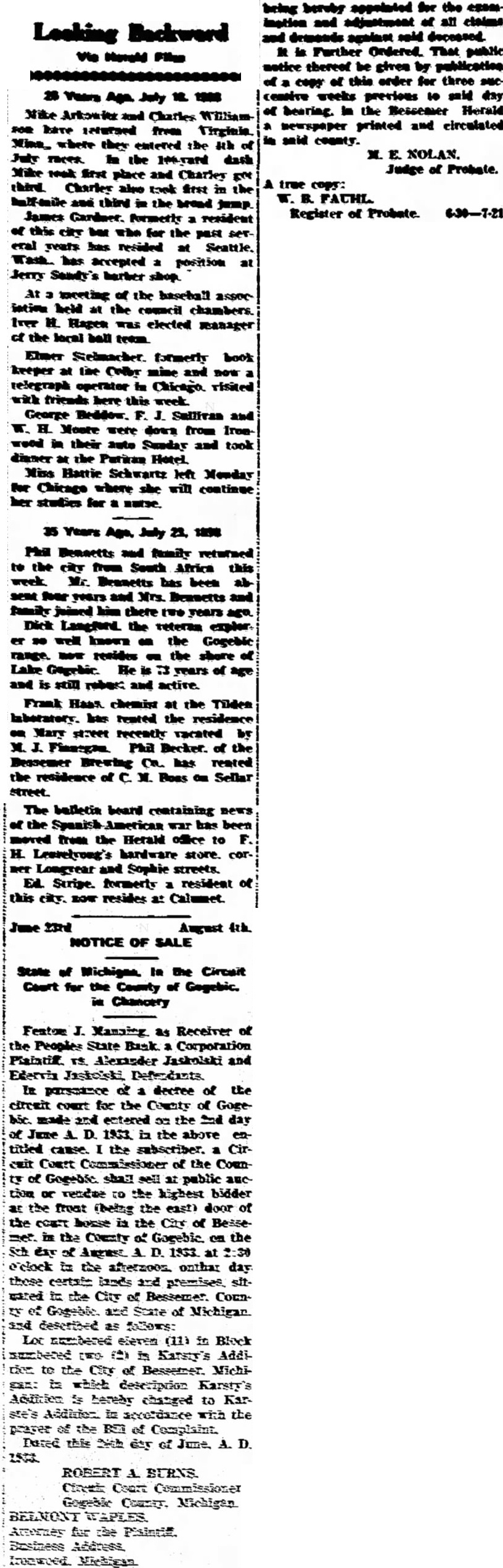 In pursuance of decree of the Circuit Court for the County Gogebic. entered on the 31st day of D. 1938, in the above entitled cause: decree has duly assigned Fenton Manning, Receiver Peoples State Bank, corporation, Alexander by assignment dated and filed the Court missioner the County Gogebic, public auction or vendue to the highest bidder the front (being east) door the court house in the City Bessemer. the 26th day SepCounty 2:30 o'clock the afternoon. tember, day these certain lands and situated the County State of Michigan, and deGogebic, scribed follows: eleven (11) and twelve (12) Block tweive Hibbing's City Bessemer. Dated dition this to 9th day of August, D. 1932. Circuit Court ROBERT BURNS. County, Michigan. BELMONT Attorney Plaintiff, Business Address: Ironwood, Michigan.
