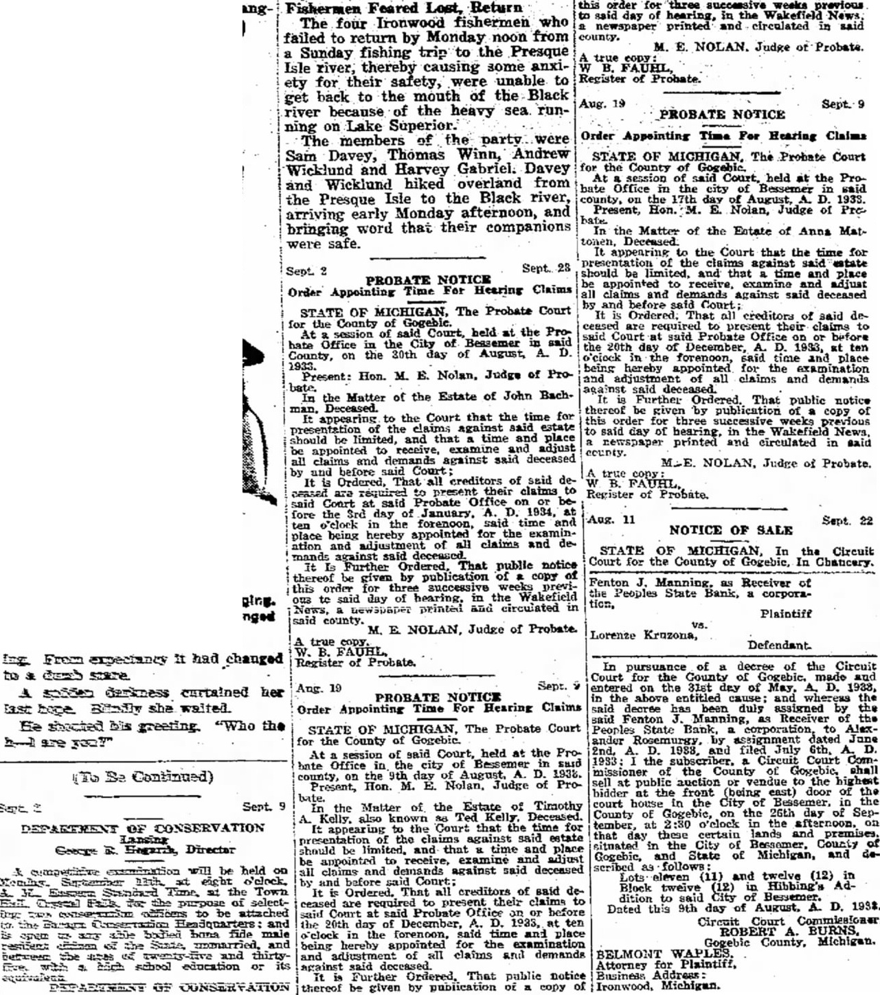 Ang. 19 Sept. PROBATE NOTICE Order Appointing Time For Hearing Claims STATE OF MICHIGAN, The Probate Court for the County of Gogebic. At session of said Court, Bessemer held at the ProOffice the city on the 9th day county, Hon. Nolan, Judge of Pro- the Matter of the Ted Estate Kelly. of Deceased. Timothy Kelly. also known to the Court that the time for the estate should and that time and place appointed to examine adjust claims and demands against said deceased before said Court: Ordered. That all creditors of said derequired their claims are at said Probate Office before the 20th day of December, 1933, ten in the forenoon, said time and place being hereby appointed for the examination and claims and demands said Further Ordered, That public notice thereof be given by publication of copy this order for three successive weeks previous said hearing, in the Wakefield News, newspaper printed and circulated in said county. M. E. NOLAN. Judge of true Register of Probate.