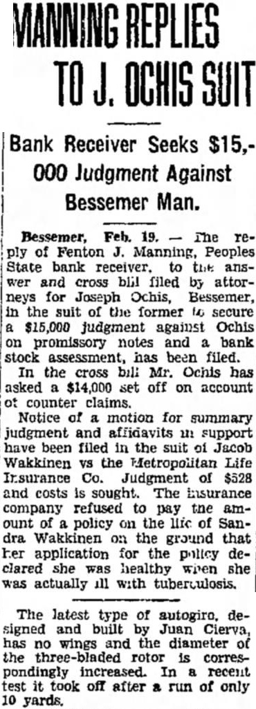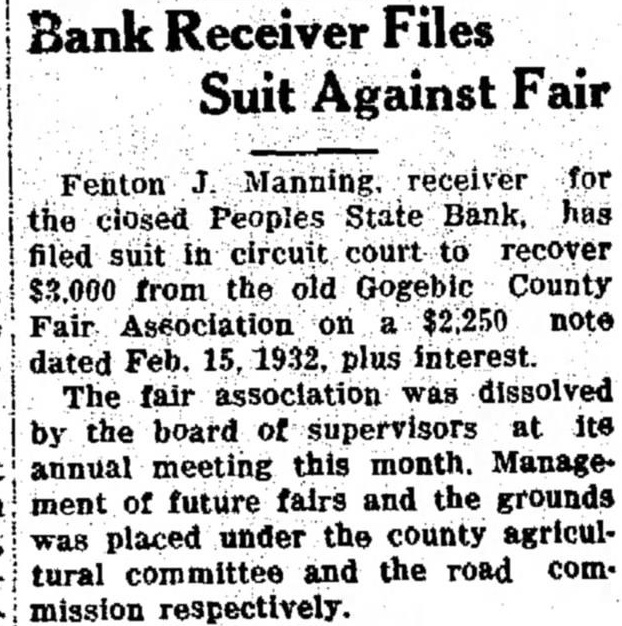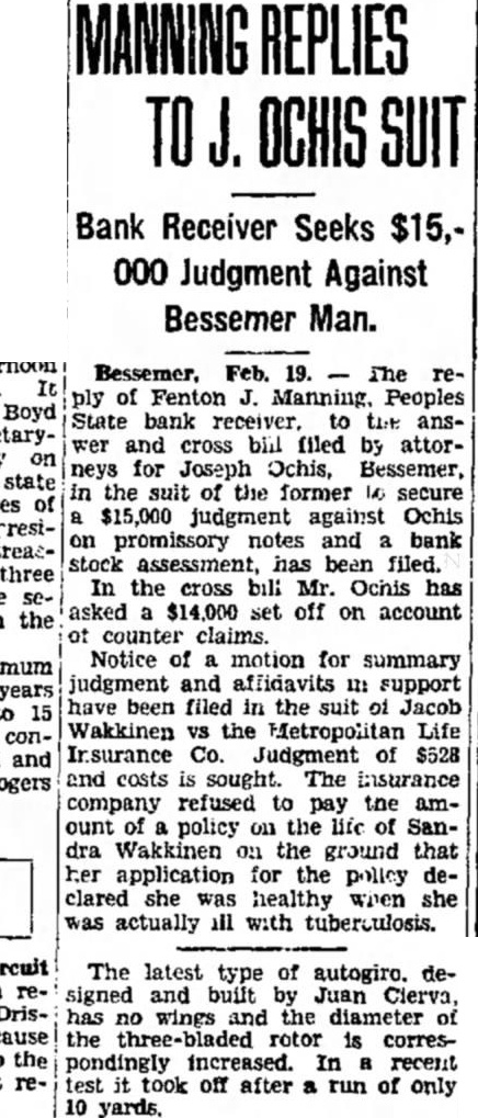 STATE OF In the Circuit Court for the County of Gogebic, In Chancery. Fenton J. Manning, Receiver of Peoples State Bank, a corporation, Plaintiff