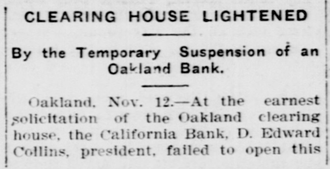 CLEARING HOUSE LIGHTENED By the Temporary Suspension of an Oakland Bank. Oakland, Nov. 12.-At the earnest solicitation of the Oakland clearing house, the California Bank, D. Edward Collins, president, failed to open this