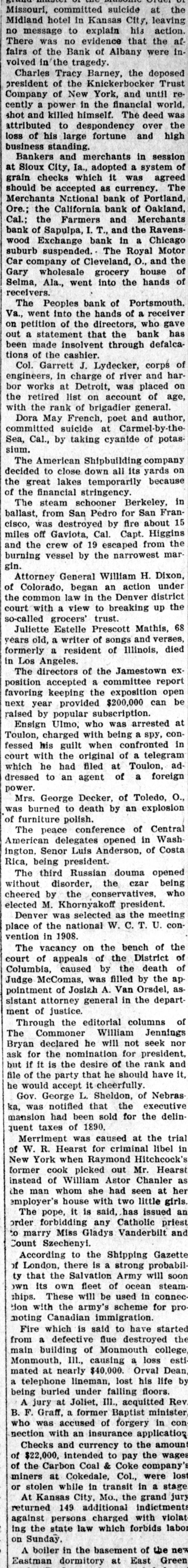 Missouri, committed suicide at the Midland hotel in Kansas City, leaving no message to explain his action. There was no evidence that the af fairs of the Bank of Albany were involved the tragedy. Charles Tracy Barney, the deposed president of the Knickerbocker Trust Company of New York, and until recently a power in the financial world, shot and killed himself. The deed was attributed to despondency over the loss of his large fortune and high business standing. Bankers and merchants in session at Sioux City, Ia., adopted a system of grain checks which it was agreed should be accepted as currency. The Merchants National bank of Portland, Ore.; the California bank of Oakland, Cal.: the Farmers and Merchants Ravens- the a "L I Sending, TO bank wood Exchange bank in a Chicago suburb suspended. The Royal Motor Car company of Cleveland, O., and the Gary wholesale grocery house of Selma, Ala., went into the hands of receivers. The Peoples bank of Portsmouth. Va., went into the hands of a receiver on petition of the directors, who gave out a statement that the bank has been made insolvent through defalcations of the cashier. Col. Garrett J. Lydecker, corps of engineers, in charge of river and harbor works at Detroit, was placed on the retired list on account of age, with the rank of brigadier general. Dora May French, poet and author, committed suicide at Carmel-by-theSea, Cal., by taking cyanide of potassium. The American Shipbuilding company decided to close down all its yards on the great lakes temporarily because of the financial stringency. The steam schooner Berkeley, in ballast, from San Pedro for San Francisco, was destroyed by fire about 15 miles off Gaviota, Cal. Capt. Higgins and the crew of 19 escaped from the burning vessel by the narrowest marshing Attorney General William H. Dixon, of Colorado, began an action under the common law in the Denver district court with a view to breaking up the so-called grocers' trust. Juliette Estelle Prescott Mathis, 68 years old, a writer of songs and verses. formerly a resident of Illinois, died Anseles. SOT u] The directors of the Jamestown exposition accepted a committee report favoring keeping the exposition open next year provided $200,000 can be raised by popular subscription. Ensign Ulmo, who was arrested at Toulon, charged with being a spy, confessed his guilt when confronted in court with the original of a telegram which he had filed at Toulon, addressed to an agent of a foreign power. Mrs. George Decker, of Toledo, O., was burned to death by an explosion of furniture polish. The peace conference of Central American delegates opened in Washington, Senor Luis Anderson, of Costa Rica, being president. The third Russian douma opened without disorder, the czar being cheered by the conservatives, who elected M. Khornyakoff president. Denver was selected as the meeting place of the national W. C. T. U. con19061 up vention The vacancy on the bench of the court of appeals of the District of Columbia, caused by the death of Judge McComas, was filled by the appointment of Josiah A. Van Orsdel, assistant attorney general in the department of justice. Through the editorial columns of The Commoner William Jennings Bryan declared he will not seek nor ask for the nomination for president, but if it is the desire of the rank and file of the party that he should have it, he would accept it cheerfully. Gov. George L. Sheldon, of Nebras ka, was notified that the executive mansion had been sold for the delinquent taxes of 1890. Merriment was caused at the trial of W. R. Hearst for criminal libel in New York when Raymond Hitchcock's former cook picked out Mr. Hearst instead of William Astor Chanler as the man whom she had seen at her employer's house with two little girls us penss! has said si 11 'edod eque order forbidding any Catholic priest to marry Miss Gladys Vanderbilt and Count Szechenyi. According to the Shipping Gazette of London, there is a strong probabil ty that the Salvation Army will soon own its own fleet of ocean steam ships. These will be used in connection with the army's scheme for pro moting Canadian immigration. Fire which is said to have started from a defective flue destroyed the main building of Monmouth college, Monmouth, III., causing a loss esti mated at nearly $40,000. Orval Dean a telephone lineman, lost his life by being buried under falling floors. A jury at Joliet, III., acquitted Rev B. F. Graff, a former Baptist minister who was accused of forgery in con