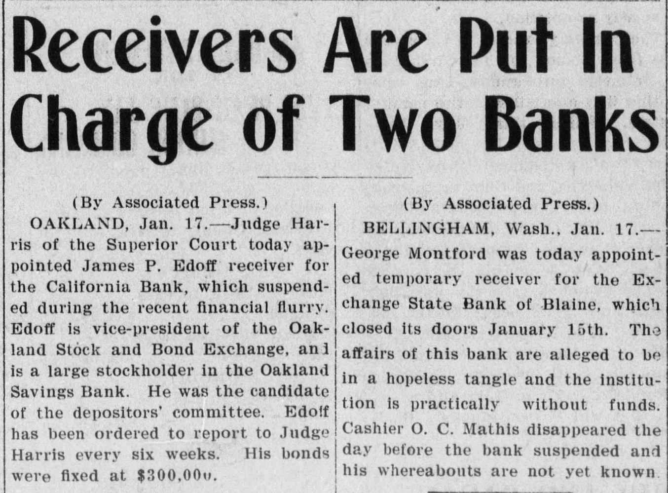 Receivers Are Put In Charge of Two Banks (By Associated Press.) (By Associated Press.) OAKLAND, Jan. 17.-Judge HarBELLINGHAM, Wash., Jan. 17. ris of the Superior Court today apGeorge Montford was today appointpointed James P. Edoff receiver for ed temporary receiver for the Exthe California Bank, which suspendchange State Bank of Blaine, which ed during the recent financial flurry. Edoff is vice-president of the Oakclosed its doors January 15th. The land Stock and Bond Exchange, and affairs of this bank are alleged to be is a large stockholder in the Oakland in a hopeless tangle and the instituSavings Bank. He was the candidate tion is practically without funds. of the depositors' committee. Edoff Cashier O. C. Mathis disappeared the has been ordered to report to Judge day before the bank suspended and Harris every six weeks. His bonds his whereabouts are not yet known. were fixed at $300,00v.