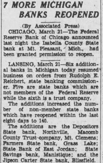 MORE MICHIGAN BANKS REOPENED (By Associated Press) CHICAGO, March Federal Reserve Bank of Chicago announced last night the Isabella County State Mt. Pleasant, Mich., had been granted permission to reopen. LANSING, March additionbanks Michigan today resumed business on orders from Rudolph Reichert, state Five are state banks which are not the Federal Reserve while the sixth trust company. The the numstate banks which have reopened within the last eight days additions are the Depositors State bank, Northville, Macomb County Mt. Clemens; Farmers State bank, Grass Lake: State Bank of East Jordan; State Savings bank, and the Jipson Carter State bank, Blissfield.