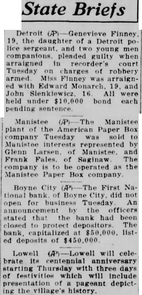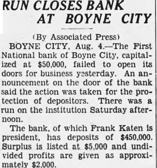 RUN CLOSES BANK AT BOYNE CITY By Associated Press) BOYNE CITY, Aug. 4.-The First National bank of Boyne City, capitalized at $50,000, failed to open its doors for business yesterday. An announcement on the door of the bank said the action was taken for the protection of depositors. There was run on the institution Saturday afternoon. The bank. of which Frank Katen is president, has deposits of $450,000. Surplus is listed at $5,000 and undivided profits are given as approximately $2,000.