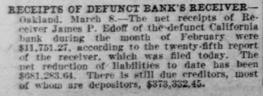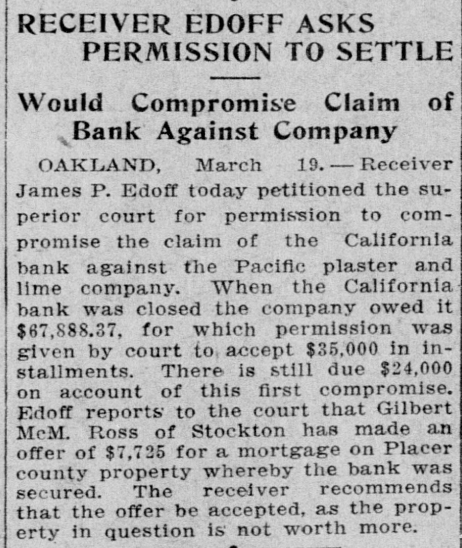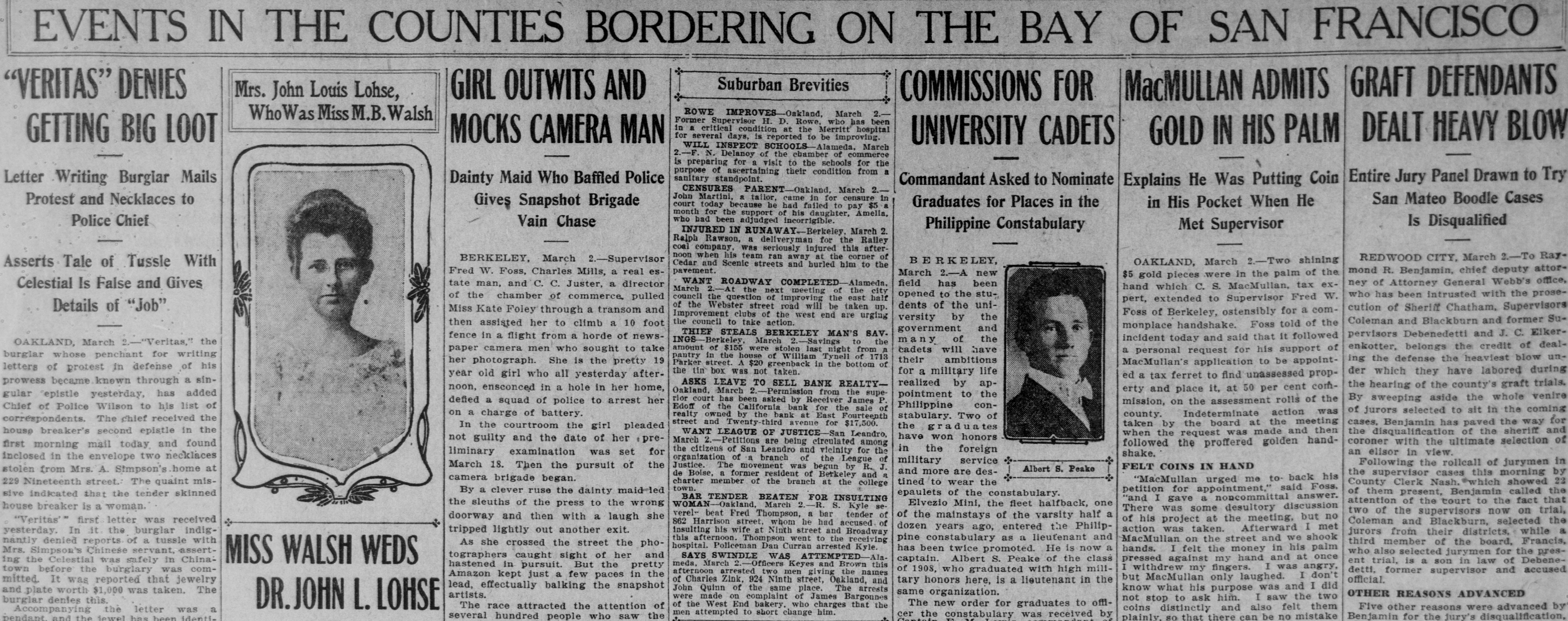 EVENTS IN THE COUNTIES BORDERING ON THE BAY OF SAN FRANCISCO Suburban Brevities DEFENDAN GRAFT "VERITAS" DENIES GIRL OUTWITS AND Mrs. John Louis Lohse, COMMISSIONS FOR MacMULLAN ADMITS ROWE IMPROVES Oakland, March Who Was Miss M.B. Walsh Former Supervisor H. D. Rowe who has been in critical condition at the Merritt hospital for several days, is reported to be improving. DEALT HEAVY BL GETTING BIG LOOT MOCKS CAMERA MAN UNIVERSITY CADETS GOLD IN HIS PALM WILL INSPECT SCHOOLS Alameda, March 2 N. Delanoy of the chamber of commerce is preparing for a visit to the schools for the purpose of ascertaining their condition from sanitary standpoint. Entire Jury Panel Drawn to Commandant Asked to Nominate Dainty Maid Who Baffled Police Letter Writing Burgiar Mails Explains He Was Putting Coin CENSURES PARENT Oakland, March 2. John Martini, a tailor. came in for censure in San Mateo Boodle Case Protest and Necklaces to Graduates for Places in the in His Pocket When He Gives Snapshot Brigade court today because he had failed to pay $5 a month for the support of his daughter, Amella. who had been adjudged incorrigible. Police Chief Vain Chase Is Disqualified Philippine Constabulary Met Supervisor INJURED IN RUNAWAY.-Berkeley March 2 Ralph Rawson, a deliveryman for the Ralley coal company. was seriously injured this afternoon when his team ran away at the corner of REDWOOD CITY, March 2.-To BERKELEY. March Supervisor BERKELEY, OAKLAND, March 2-Two shining Asserts Tale of Tussle With Cedar and Scenic streets and hurled him to the pavement. mond R. Benjamin, chief deputy Fred W. Foss, Charles Mills, a real esMarch 2.-A new $5 gold pieces were in the palm of the WANT ROADWAY COMPLETED Alameda. field has been ney of Attorney General Webb's tate man, and C. C. Juster, a director Celestial Is False and Gives hand which C. S. MacMullan, tax exMarch 2. At the next meeting of the city who has been intrusted with the opened to the stuof the chamber of commerce, pulled council the question of improving the east half pert, extended to Supervisor Fred W. dents of the uniof the Webster street road will be taken up. cution of Sheriff Chatham, Super Details of "Job" Miss Kate Foley through a transom and Foss of Berkeley, ostensibly for a comImprovement clubs of the west end are urging versity by the Coleman and Blackburn and form the council to take action. then assisted her to climb a 10 foot monplace handshake. Foss told of the government and THIEF STEALS BERKELEY MAN'S SAV. pervisors Debenedetti and J. C. fence in a flight from a horde of newsincident today and said that it followed many of the INGS Berkeley, March -Savings to the OAKLAND, March "Veritas, the enkotter, belongs the credit of amount of $155 were stolen last night from paper camera men who sought to take cadets will have a personal request for his support of burglar whose penchant for writing pantry in the house of William Tynell of 1713 ing the defense the heaviest blo their ambitions her photograph. She is the pretty 19 MacMullan's application to be appointParker street $20 greenback in the bottom of letters of protest in defense of his the tin box was not taken. for a military life der which they have labored year old girl who all yesterday aftered a tax ferret to find unassessed propprowess became known through a sinASKS LEAVE TO SELL BANK REALTYrealized by apthe hearing of the county's graft noon, ensconced in a hole in her home, erty and place it, at 50 per cent comOakland, March Permission from the supepointment to the gular epistle yesterday, has added By sweeping aside the whole rior court has been asked by Receiver James P defied a squad of police to arrest her mission, on the assessment rolls of the Philippine conChief of Police Wilson to his list of Edoff of the California bank for the sale of of jurors selected to sit in the on a charge of battery. county. Indeterminate action was realty owned by the bank at East Fourteenth stabulary. Two of correspondents. The chief received the street and Twenty-third avenue for $17,500. cases, Benjamin has paved the w taken by the board at the meeting the In the courtroom the girl pleaded house breaker's second epistle in the the disqualification of the sheri when the request was made and then WANT LEAGUE OF JUSTICE San Leandro, have won honors not guilty and the date of her precoroner with the ultimate select March 2.-Petitions are being circulated among followed the proffered golden handfirst morning mail today and found in the foreign the citizens of San Leandro and vicinity for the an elisor in view. liminary examination was set for shake. inclosed in the envelope two necklaces organization of a branch of the League of military service Following the rollcall of juryn FELT COINS IN HAND March 18. Then the pursuit of the J. Justice. The movement was begun by R. Albert S. Peake stolen from Mrs. A. Simpson's home at and more are desthe supervisor cases this morni de Bolse. a former resident of Berkeley and camera brigade began. "MacMullan urged me to back his County Clerk Nash. #which show tined to wear the 229 Nineteenth street. The quaint mischarter member of the branch at the college town. petition for appointment," said Foss. By a clever ruse the dainty maideled of them present, Benjamin calle epaulets of the constabulary. sive indicated that the tender skinned BAR TENDER BEATEN FOR INSULTING "and I gave a noncommittal answer. attention of the tourt to the fac the sleuths of the press to the wrong Elvezio Mini, the fleet halfback, one WOMANOakland March 2 R. S. Kyle house breaker is a woman. There was some desultory discussion two of the supervisors now on verel- beat Fred Thompson, a bar tender of of the mainstays of the varsity half a doorway and then with a laugh she "Veritás first letter was received of his project at the meeting, but no Coleman and Blackburn, selecte 862 Harrison street. whom he had accused of dozen years ago, entered the Philipaction was taken. Afterward I met tripped lightly