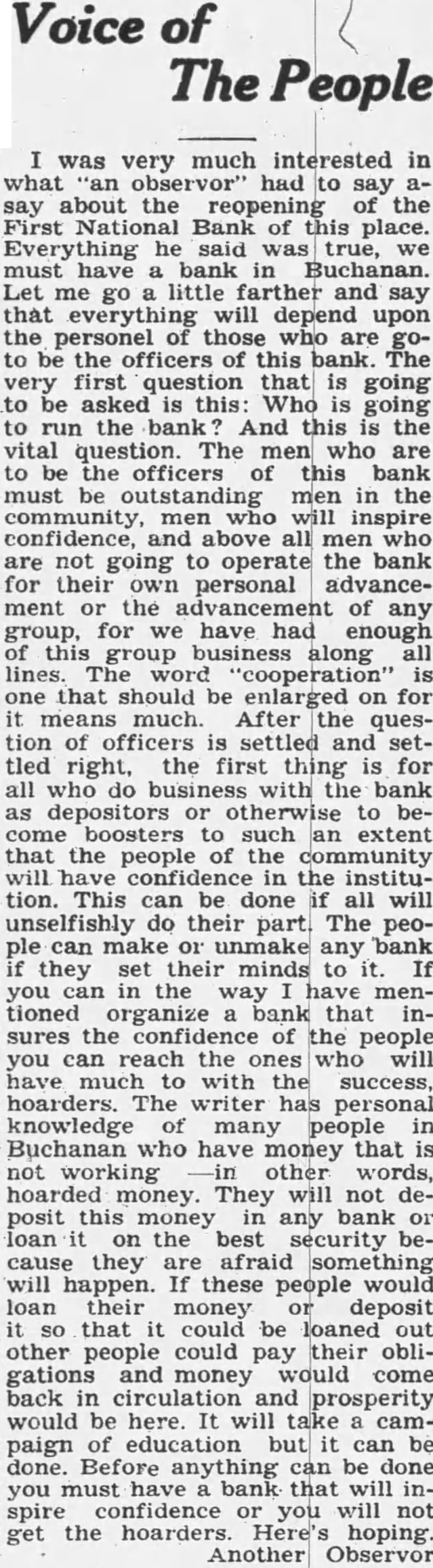 Voice of The People I was very much interested in what "an observor" had to say asay about the reopening of the First National Bank of this place. Everything he said was true, we must have a bank in Buchanan. Let me go a little farther and say that everything will depend upon the personel of those who are goto be the officers of this bank. The very first question that is going to be asked is this: Who is going to run the bank And this is the vital question. The men who are to be the officers of this bank must be outstanding men in the community, men who will inspire confidence, and above all men who are not going to operate the bank for their own personal advancement or the advancement of any group, for we have had enough of this group business along all lines. The word "cooperation" is one that should be enlarged on for it means much. After the question of officers is settled and settled right, the first thing is for all who do business with the bank as depositors or otherwise to become boosters to such an extent that the people of the community will have confidence in the institution. This can be done if all will unselfishly do their part. The people can make or unmake any bank if they set their minds to it. If you can in the way have mentioned organize a bank that insures the confidence of the people you can reach the ones who will have much to with success, hoarders. The writer has personal knowledge of many people in Buchanan who have money that is not working other words, hoarded money. They will not deposit this money in any bank or loan it on the best security because they are afraid something will happen. If these people would loan their money deposit it so that it could be loaned out other people could pay their obligations and money would come back in circulation and prosperity would be here. It will take a campaign of education but it can be done. Before anything can be done you must have a bank that will inspire confidence or you will not get the hoarders. Here's hoping. Another Observor