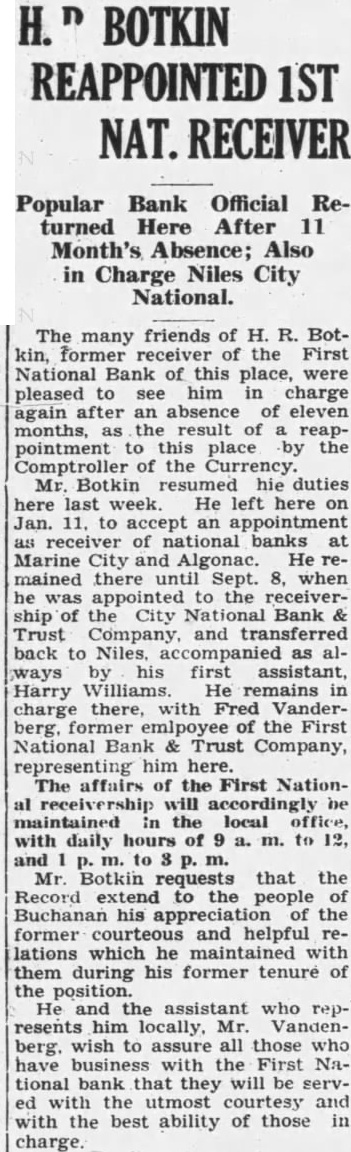 BOTKIN REAPPOINTED RECEIVER Popular Bank Official Returned Here After Month's Absence; Also in Charge Niles City National. The many friends of R. Botkin, former receiver of the First National Bank of this place, were pleased him in charge after an absence of eleven again months, the result of pointment to this place by the Comptroller of the Currency. Mr. Botkin resumed duties here last week. He left here on Jan. to accept an appointment receiver of national banks at Marine City and Algonac. He mained there Sept. when he was appointed to the ship of the City Bank Trust Company, and transferred back to Niles. accompanied as ways his first assistant, Harry He remains charge there, with Fred Vanderberg. former emlpoyee of the First National Bank Trust Company, representing him here. The affairs of the First Nationwill accordingly the local with daily hours of to and to Mr. Botkin requests that the Record extend the people of Buchanan appreciation the former courteous and helpful lations which he maintained with them during former tenure of the position. He and the assistant who resents him locally, Mr. Vandenberg. wish to assure all those who have with the First National bank that they will be ed with the utmost and with the best ability of those in charge.