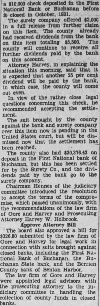 $10,000 check deposited in the First National Bank or Buchanan before it closed in October, 1931. The surety company offered $2,000 in full release from further claim on this item. The county already had received dividends from the bank on this item totaling $5,500. The county will continue to receive all further dividends paid by the bank this account. on Attorney Harvey, in explaining the situation this morning, said that it is expected that another 25 per cent dividend will be paid by the bank, in which case, the county will come out even. In view of the rather close legal questions this check, he recommended accepting the settlement. The suit brought by the county against the bank and surety company over this item now pending in the United States court, but will be dismissed now that the settlement has been reached. The county also had $30,376.42 on deposit in the First National bank of Buchanan, but this has been settled for by the Surety Co. and the dividends paid by the bank go to the surety company Chairman Hennes of the judiciary committee introduced the resolution to accept the terms of the compromise, which passed unanimously, with the of the law firm of Gore and Harvey and Prosecuting Attorney Harvey W. Holbrook. Approve Attorney The board also approved bill for submitted by the law firm of Gore and Harvey for legal work in connection with suits brought against closed banks, including the First National Bank of Buchanan, the Buchanan State bank, and the Berrien County bank of Benton Harbor. The law firm Gore and Harvey were appointed legal advisors with the prosecuting attorney to the judiciary in handling the collection of county funds in closed banks.