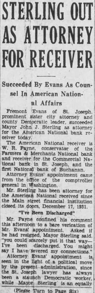 STERLING OUT AS ATTORNEY FOR RECEIVER Succeeded By Evans As Counsel In American National Affairs Fremont Evans of St. Joseph. prominent sister city attorney and county Democratic leader. succeeded Mayor John Sterling as attorney for the American National bank receiver today. The American National receiver R. Payne, conservator of the Farmers & Merchants National bank and receiver for the Commercial National bank in St. Joseph, and the first National bank of Buchanan. Attorney Evans' appointment from the office of the comptroller general in Washington. Mr. Sterling has been attorney for the American National received since the Main street financial institution closed its doors, December 17. 1931. "I've Been Discharged" Mr. Payne confined his comment afternoon to bare verication Mr. Evans' appointment. Asked he had resigned, Mayor Sterling said, "you could scarcely put it that wayI've been discharged. You might say my connections.' Attorney Evans' appointment seen in the light political move the present administration, since the St. Joseph lawyer has always been staunch Democratic worker, while Mayor Sterling is an equally (Please Turn to Page Six)