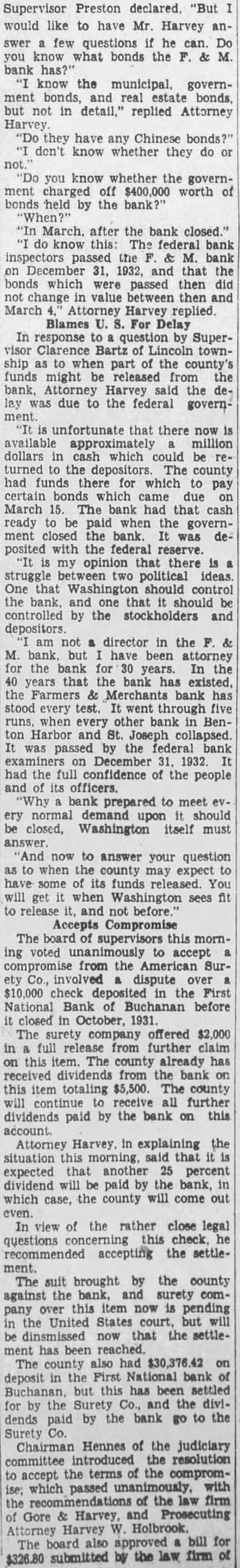 Supervisor Preston declared "But would like have Mr. Harvey answer few questions he can Do you know what bonds the & bank know the government and real estate bonds, but not in detail." replied Attorney Harvey "Do they have any Chinese bonds?" don't know whether they do or know whether the government charged off $400,000 worth of "In March. after the bank closed." do know The federal bank inspectors passed M. bank December 1932, and that the bonds which were passed then did not change value between then and March Attorney Harvey replied. Blames For Delay In response to question by Supervisor Clarence Bartz Lincoln township when part the county's funds might released the Harvey defederal governunfortunate that there now available approximately million dollars in cash which could be returned the The county had funds there for which to pay certain came on March 15. bank had that ready paid the government closed the bank. deposited with the federal reserve. my opinion that there is political ideas One should control the bank, and that should controlled by the stockholders and director in the M. bank, been attorney for the bank for years. In the years that the bank existed, the bank has stood every test. through runs, when every other bank passed the federal examiners on December 31, 1932 had the full confidence of the people "Why bank prepared to meet ery normal demand upon should closed, Washington itself must 'And to answer your question when the county may expect funds You will get when Washington sees fit before. Accepts Compromise The board supervisors this morning voted accept from the American Sur$10,000 check deposited the First National Bank Buchanan before The surety offered $2,000 in full release from further claim on this The county already has dividends from the bank on this item totaling $5,500. The county will receive further dividends paid by the bank on this Harvey in explaining the situation that expected that another 25 percent dividend will paid by the bank, which case, the county will come out In view of the rather close legal questions this check accepting the settlement. The suit brought by the county against the bank, and surety company over item now pending the United States court, but will that the settle ment has been reached. The county also $30,376.42 on deposit the First National bank but this has settled for by the the divi. dends by the bank go to the Surety Chairman Hennes of the judiciary committee introduced the resolution accept the terms the compromise; which passed with the of the law Gore & Harvey, Prosecuting Attorney Harvey Holbrook. approved bill for The board the firm of $326.80