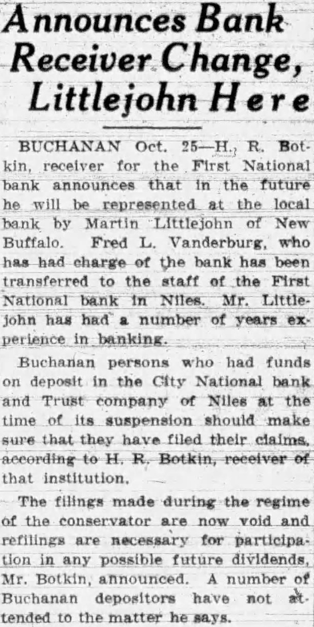 Announces Bank Receiver Change, Littlejohn Here BUCHANAN Oct. 25-H., R. Bot kin, receiver for the First National bank announces that in the future he will be represented at the local bank by Martin Littlejohn of New Buffalo. Fred L. Vanderburg, who has had charge of the bank has been transferred to the staff of the First National bank in Niles. Mr. Littlejohn has had number of years ex perience in banking Buchanan persons who had funds on deposit in the City National bank and Trust company of Niles at the time of its suspension should make sure that they have filed their claims. according to H. R. Botkin, receiver of that institution. The filings made during the regime of the are now void and refilings are for participation in any possible future dividends, Mr. Botkin, announced. number of Buchanan depositors have not at tended to the matter he says.