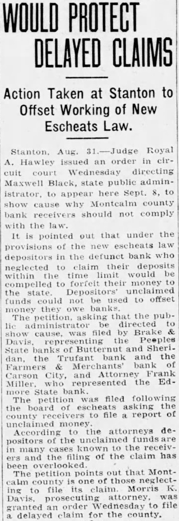 WOULD PROTECT DELAYED CLAIMS Action Taken at Stanton to Offset Working of New Escheats Law. A. Hawley issued an order in circuit court Wednesday directing Maxwell Black, public administrator, appear here Sept. 8, to show cause why Montcalm county bank receivers should not comply with the law. It is pointed out that under the provisions of the new escheats law depositors in the defunct bank who neglected to claim their deposits within the time would be compelled to forfeit their money the state Depositors' unclaimed funds could not be to offset money they banks the pubThe lic be directed to was filed by Brake show cause, Davis representing the Peoples State Butternut and Sheri. Trufant bank and the dan, the Farmers bank Carson City, and Attorney Frank Miller. represented the Edmore State The petition was filed following board of asking the county file a report of unclaimed According to the attorneys depositors of the unclaimed funds in many cases known to the receivers and the filing of the claim has been The petition out that Montcalm county one of those neglect file its Morris K. ing to Davis, prosecuting attorney granted an order Wednesday to file delayed claim for the county.