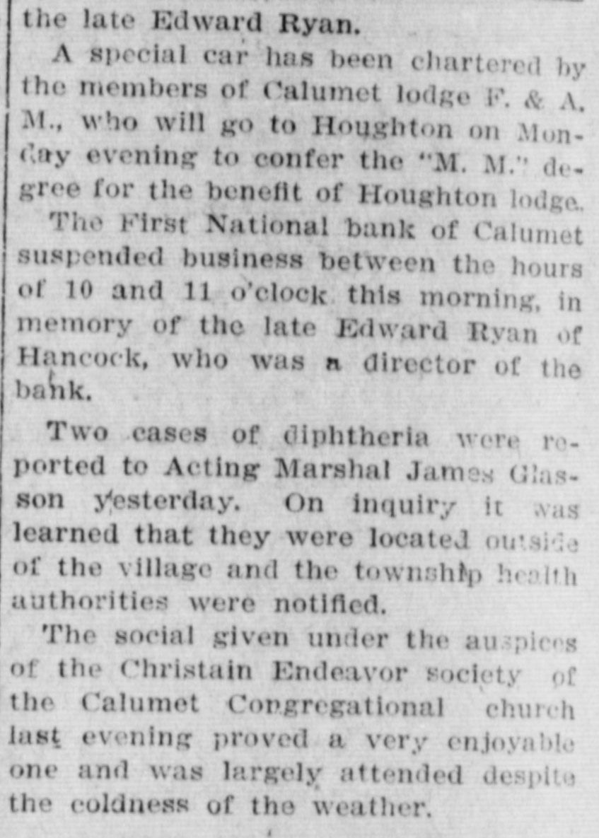 the late Edward Ryan. A special car has been chartered by the members of Calumet lodge F. & A, M., who will go to Houghton on Monday evening to confer the "M. M." degree for the benefit of Houghton lodge. The First National bank of Calumet suspended business between the hours of 10 and 11 o'clock this morning, in memory of the late Edward Ryan of Hancock, who was a director of the bank. Two cases of diphtheria were reported to Acting Marshal James Glasson yesterday. On inquiry it was learned that they were located outside of the village and the township health authorities were notified. The social given under the auspices of the Christain Endeavor society of the Calumet Congregational church last evening proved a very enjoyable one and was largely attended despite the coldness of the weather.