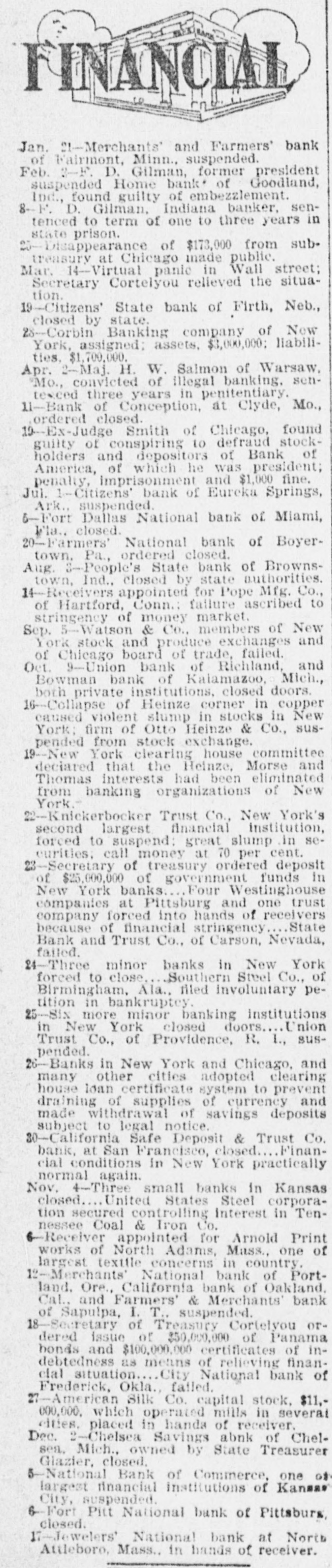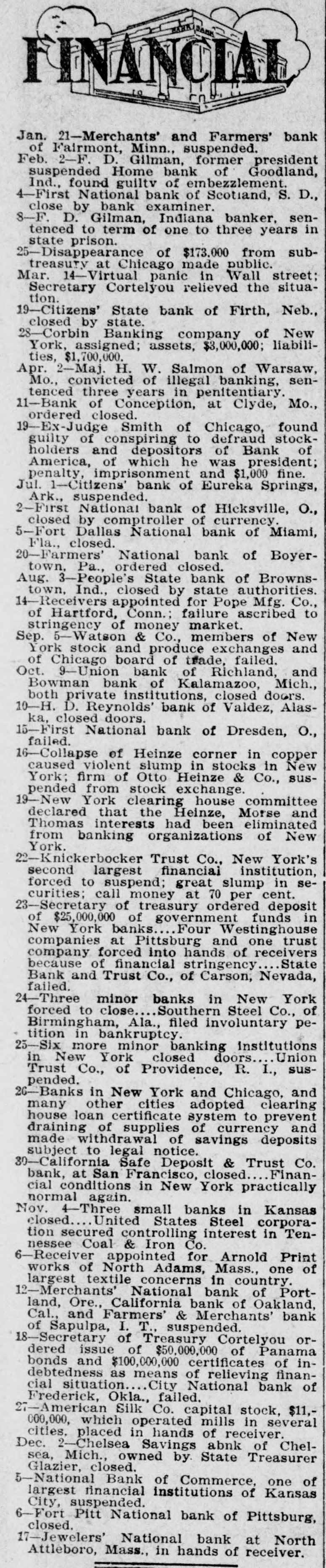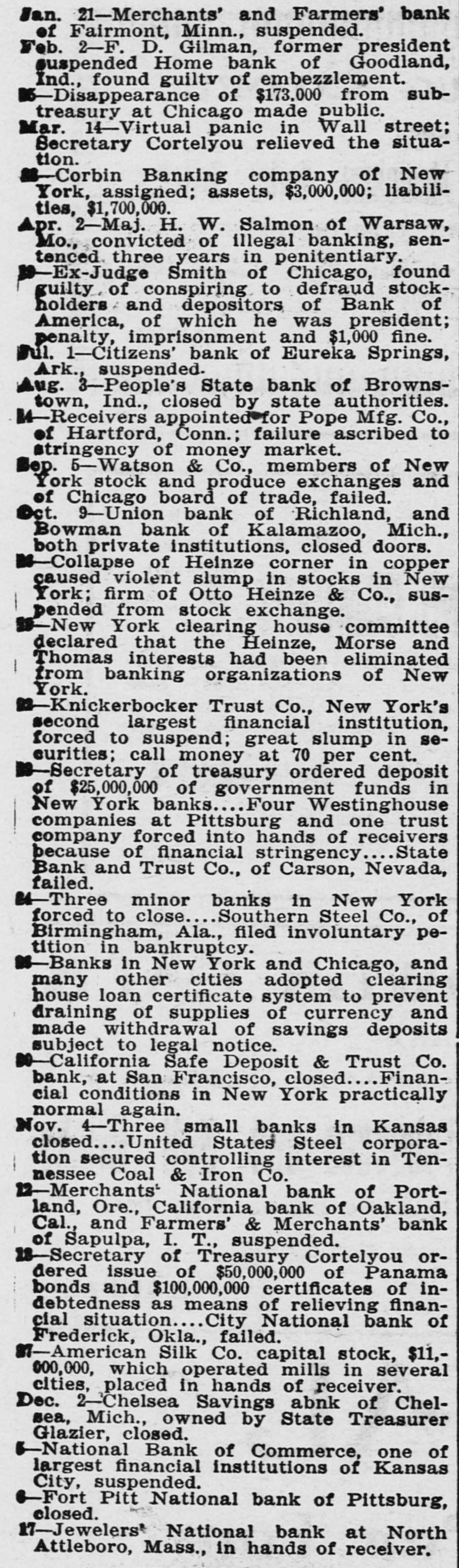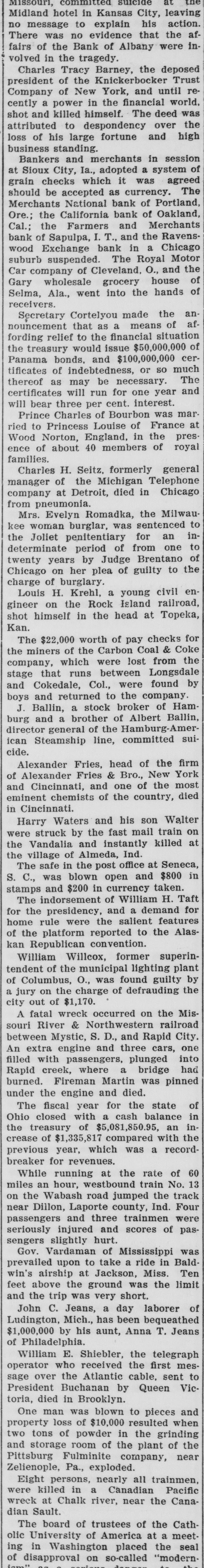 Missouri, committed Midland hotel in Kansas City, leaving no message to explain his action. There was no evidence that the affairs of the Bank of Albany were involved in the tragedy. Charles Tracy Barney, the deposed president of the Knickerbocker Trust Company of New York, and until recently a power in the financial world, shot and killed himself. The deed was attributed to despondency over the loss of his large fortune and high business standing. Bankers and merchants in session at Sioux City, Ia., adopted a system of grain checks which it was agreed should be accepted as currency. The Merchants National bank of Portland, Ore.; the California bank of Oakland, Cal.; the Farmers and Merchants bank of Sapulpa, I. T., and the Ravenswood Exchange bank in a Chicago suburb suspended. The Royal Motor Car company of Cleveland, O., and the Gary wholesale grocery house of Selma, Ala., went into the hands of receivers. Secretary Cortelyou made the announcement that as a means of affording relief to the financial situation the treasury would issue $50,000,000 of Panama bonds, and $100,000,000 certificates of indebtedness, or SO much thereof as may be necessary. The certificates will run for one year and will bear three per cent. interest. Prince Charles of Bourbon was married to Princess Louise of France at Wood Norton, England, in the presence of about 40 members of royal families. Charles H. Seitz. formerly general manager of the Michigan Telephone company at Detroit, died in Chicago from pneumonia. Mrs. Evelyn Romadka, the Milwaukee woman burglar, was sentenced to the Joliet penitentiary for an indeterminate period of from one to twenty years by Judge Brentano of Chicago on her plea of guilty to the charge of burglary. Louis H. Krehl, a young civil engineer on the Rock Island railroad, shot himself in the head at Topeka, Kan. The $22,000 worth of pay checks for the miners of the Carbon Coal & Coke company, which were lost from the stage that runs between Longsdale and Cokedale, Col., were found by boys and returned to the company. J. Ballin, a stock broker of Hamburg and a brother of Albert Ballin, director general of the Hamburg-American Steamship line, committed suicide. Alexander Fries, head of the firm of Alexander Fries & Bro., New York and Cincinnati, and one of the most eminent chemists of the country, died in Cincinnati. Harry Waters and his son Walter were struck by the fast mail train on the Vandalia and instantly killed at the village of Almeda, Ind. The safe in the post office at Seneca, S. C., was blown open and $800 in stamps and $200 in currency taken. The indorsement of William H. Taft for the presidency, and a demand for home rule were the salient features of the platform reported to the Alaskan Republican convention. William Willcox, former superintendent of the municipal lighting plant of Columbus, O., was found guilty by a jury on the charge of defrauding the city out of $1,170. A fatal wreck occurred on the Missouri River & Northwestern railroad between Mystic, S. D., and Rapid City. An extra engine and three cars, one filled with passengers, plunged into Rapid creek, where a bridge had burned. Fireman Martin was pinned under the engine and died. The fiscal year for the state of Ohio closed with a cash balance in the treasury of $5,081,850.95, an increase of $1,335,817 compared with the previous year, which was a recordbreaker for revenues. While running at the rate of 60 miles an hour, westbound train No. 13 on the Wabash road jumped the track near Dillon, Laporte county, Ind. Four passengers and three trainmen were seriously injured and scores of passengers slightly hurt. Gov. Vardaman of Mississippi was prevailed upon to take a ride in Baldwin's airship at Jackson, Miss. Ten feet above the ground was the limit and the trip was very short. John C. Jeans, a day laborer of Ludington, Mich., has been bequeathed $1,000,000 by his aunt, Anna T. Jeans of Philadelphia. William E. Shiebler, the telegraph operator who received the first message over the Atlantic cable, sent to President Buchanan by Queen Victoria, died in Brooklyn. One man was blown to pieces and property loss of $10,000 resulted when two tons of powder in the grinding and storage room of the plant of the Pittsburg Fulminite company, near Zelienople, Pa., exploded. Eight persons, nearly all trainmen, were killed in a Canadian Pacific wreck at Chalk river, near the Canadian Sault. The board of trustees of the Catholic University of America at a meeting in Washingt placed the