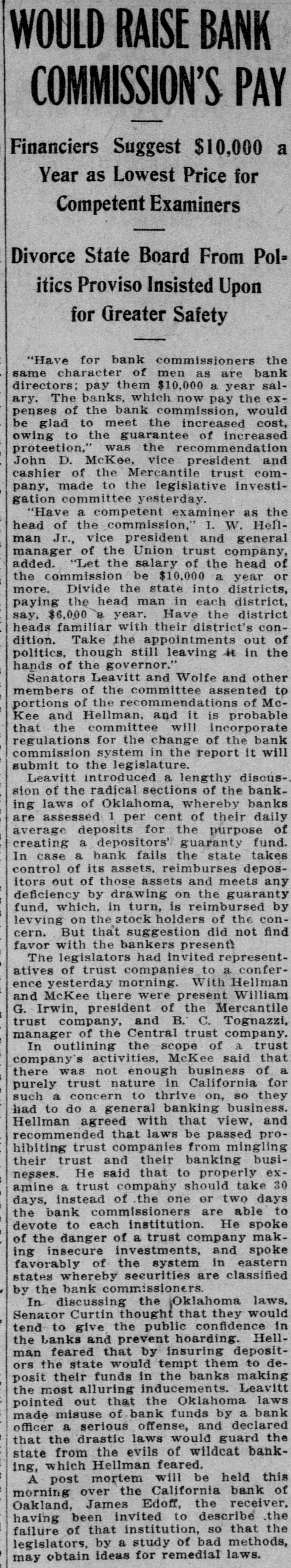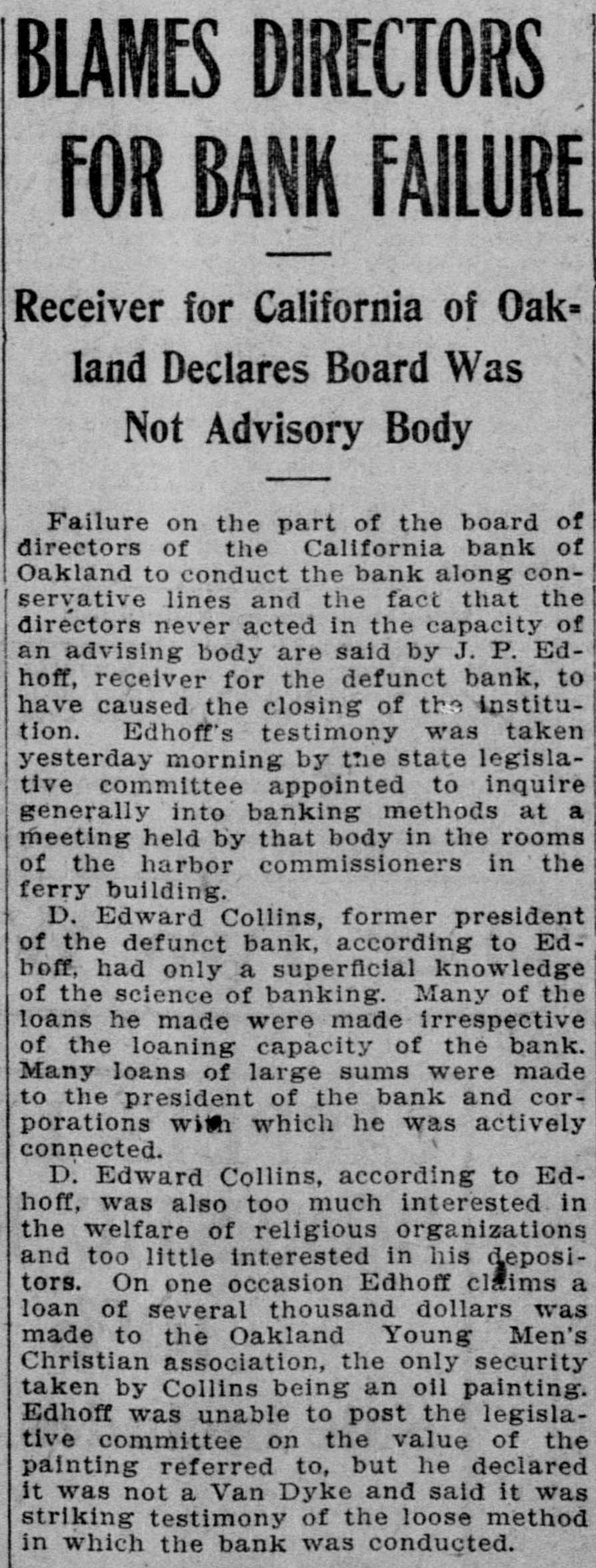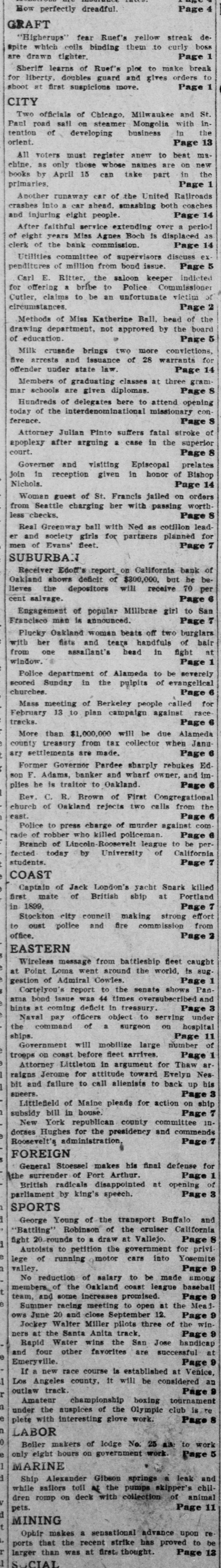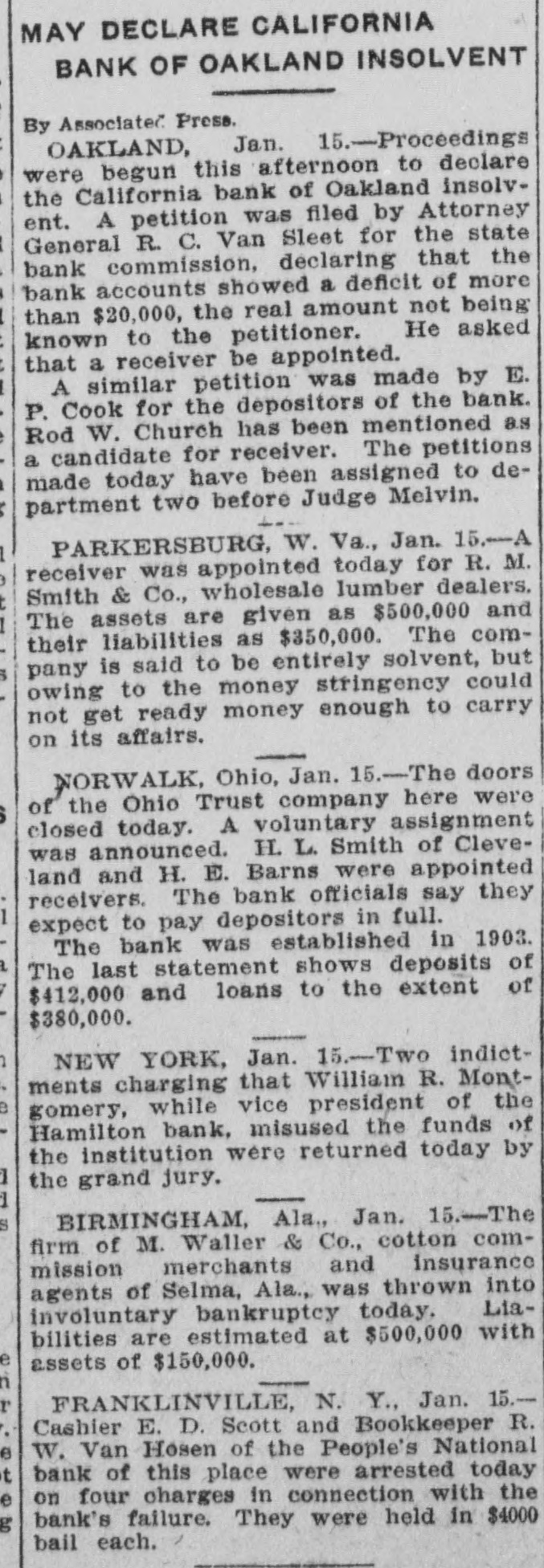 Missouri, committed Midland hotel in Kansas City, leaving no message to explain his action. There was no evidence that the affairs of the Bank of Albany were involved in the tragedy. Charles Tracy Barney, the deposed president of the Knickerbocker Trust Company of New York, and until recently a power in the financial world, shot and killed himself. The deed was attributed to despondency over the loss of his large fortune and high business standing. Bankers and merchants in session at Sioux City, Ia., adopted a system of grain checks which it was agreed should be accepted as currency. The Merchants National bank of Portland, Ore.; the California bank of Oakland, Cal.; the Farmers and Merchants bank of Sapulpa, I. T., and the Ravenswood Exchange bank in a Chicago suburb suspended. The Royal Motor Car company of Cleveland, O., and the Gary wholesale grocery house of Selma, Ala., went into the hands of receivers. Secretary Cortelyou made the announcement that as a means of affording relief to the financial situation the treasury would issue $50,000,000 of Panama bonds, and $100,000,000 certificates of indebtedness, or SO much thereof as may be necessary. The certificates will run for one year and will bear three per cent. interest. Prince Charles of Bourbon was married to Princess Louise of France at Wood Norton, England, in the presence of about 40 members of royal families. Charles H. Seitz. formerly general manager of the Michigan Telephone company at Detroit, died in Chicago from pneumonia. Mrs. Evelyn Romadka, the Milwaukee woman burglar, was sentenced to the Joliet penitentiary for an indeterminate period of from one to twenty years by Judge Brentano of Chicago on her plea of guilty to the charge of burglary. Louis H. Krehl, a young civil engineer on the Rock Island railroad, shot himself in the head at Topeka, Kan. The $22,000 worth of pay checks for the miners of the Carbon Coal & Coke company, which were lost from the stage that runs between Longsdale and Cokedale, Col., were found by boys and returned to the company. J. Ballin, a stock broker of Hamburg and a brother of Albert Ballin, director general of the Hamburg-American Steamship line, committed suicide. Alexander Fries, head of the firm of Alexander Fries & Bro., New York and Cincinnati, and one of the most eminent chemists of the country, died in Cincinnati. Harry Waters and his son Walter were struck by the fast mail train on the Vandalia and instantly killed at the village of Almeda, Ind. The safe in the post office at Seneca, S. C., was blown open and $800 in stamps and $200 in currency taken. The indorsement of William H. Taft for the presidency, and a demand for home rule were the salient features of the platform reported to the Alaskan Republican convention. William Willcox, former superintendent of the municipal lighting plant of Columbus, O., was found guilty by a jury on the charge of defrauding the city out of $1,170. A fatal wreck occurred on the Missouri River & Northwestern railroad between Mystic, S. D., and Rapid City. An extra engine and three cars, one filled with passengers, plunged into Rapid creek, where a bridge had burned. Fireman Martin was pinned under the engine and died. The fiscal year for the state of Ohio closed with a cash balance in the treasury of $5,081,850.95, an increase of $1,335,817 compared with the previous year, which was a recordbreaker for revenues. While running at the rate of 60 miles an hour, westbound train No. 13 on the Wabash road jumped the track near Dillon, Laporte county, Ind. Four passengers and three trainmen were seriously injured and scores of passengers slightly hurt. Gov. Vardaman of Mississippi was prevailed upon to take a ride in Baldwin's airship at Jackson, Miss. Ten feet above the ground was the limit and the trip was very short. John C. Jeans, a day laborer of Ludington, Mich., has been bequeathed $1,000,000 by his aunt, Anna T. Jeans of Philadelphia. William E. Shiebler, the telegraph operator who received the first message over the Atlantic cable, sent to President Buchanan by Queen Victoria, died in Brooklyn. One man was blown to pieces and property loss of $10,000 resulted when two tons of powder in the grinding and storage room of the plant of the Pittsburg Fulminite company, near Zelienople, Pa., exploded. Eight persons, nearly all trainmen, were killed in a Canadian Pacific wreck at Chalk river, near the Canadian Sault. The board of trustees of the Catholic University of America at a meeting in Washingt placed the
