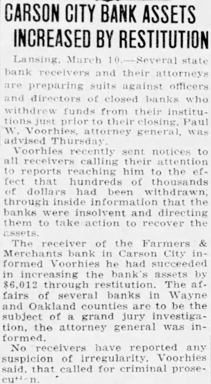 CARSON CITY BANK ASSETS INCREASED BY RESTITUTION bank and their attorneys preparing suits against officers directors of closed banks who withdrew funds from their institutions just prior to their closing, Paul advised Thursday Voorhies recently sent notices to receivers calling their attention reports reaching him to the ef fect that hundreds of thousands dollars had been withdrawn through inside information that the banks were insolvent and directing them to take action to recover the assets The receiver of the Farmers & Merchants bank in Carson City formed Voorhies he had succeeded in increasing the bank's assets by $6,012 through restitution. The fairs of several banks in Wayne and counties are to be the subject of grand jury investigation, the attorney general was informed. No receivers have reported any suspicion of irregularity. Voorhies said. that called for criminal prose-