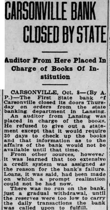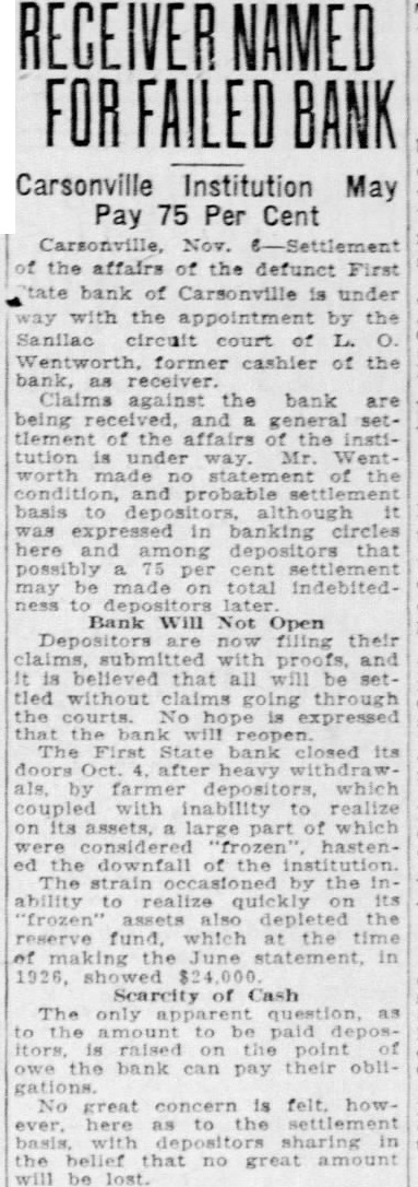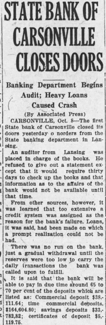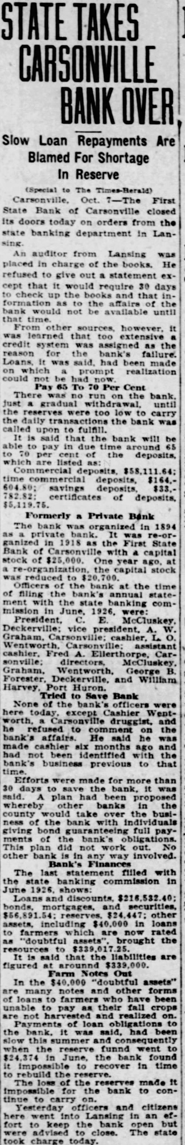 STATE TAKES CARSONVILLE BANK OVER Slow Loan Repayments Are Blamed For Shortage In Reserve (Special to Times-Herald) Oct. 7-The First State Bank of Carsonville closed its doors today orders from the on state banking department in Lanfrom Lansing was placed in of the books. He to out statement a exthat require 30 days the that inthe affairs the would not available time was learned that extensive credit assigned as the reason failure. made on prompt realization could had Pay 65 To 70 Per Cent There run the no just gradual until the carry the the bank was fulfill. It bank will be 65 cent the deposits, which listed Commercial deposits, savings deposits certificates of Formerly a Private Bank The was organized in 1894 re-organized in 1918 as the First State Bank of Carsonville with A capital stock of One at year capital stock was reduced to of the bank at the time of filing the annual statethe state banking commission in June, were: Deckerville vice president. W. cashier. A. CarGeorge B. Forester, Deckerville, and William Harvey Port Huron. Tried to Save Bank None of the bank's 's officers were here today, except Cashier Wentworth, druggist, and he to on the bank's affairs He said he was made cashier six months ago and had been identified with the bank's previous to that Efforts made for more than 30 days bank, plan been whereby other banks in the county over the business of the bank with individuals giving bond guaranteeing full payments of bank's obligations. This plan did out. other in way involved. Finances The statement filled with the banking commission in shows: bonds. and securities, other assets. including $40,000 in loans to farmers are rated as "doubtful brought the resources It is said that the liabilities are figured at arounnd Farm Notes Out In the $40,000 "doubtful assets" are and other forms of to been unable to their fall crops and realized on. Payments of loan obligations the bank. was said, had been this summer consequently the reserve went to in June, the bank found in time to rebuild reserve. The of reserves made It impossible the bank to conto carry Yesterday officers and citizens here Lansing in an fort to keep the bank open but advised to close. The state took charge today.