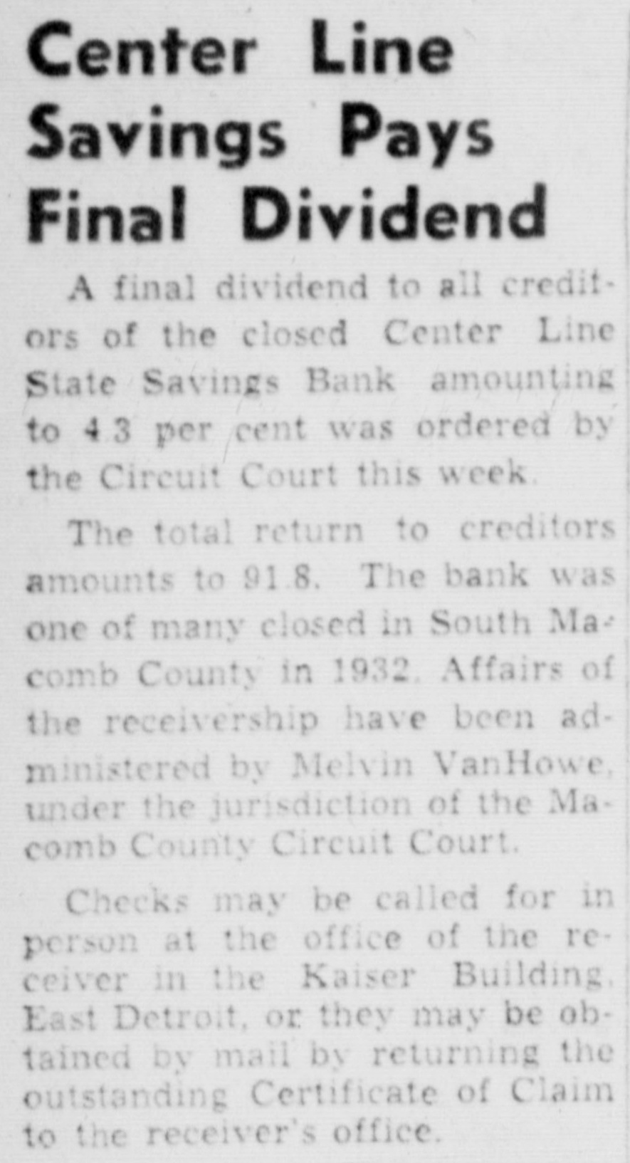 Center Line Savings Pays Final Dividend A final dividend to all creditors of the closed Center Line State Savings Bank amounting to 4.3 per cent was ordered by the Circuit Court this week. The total return to creditors amounts to 91.8. The bank was one of many closed in South Macomb County in 1932. Affairs of the receivership have been administered by Melvin VanHowe, under the jurisdiction of the Macomb County Circuit Court. Checks may be called for in person at the office of the receiver in the Kaiser Building. East Detroit, or they may be obtained by mail by returning the outstanding Certificate of Claim to the receiver's office.