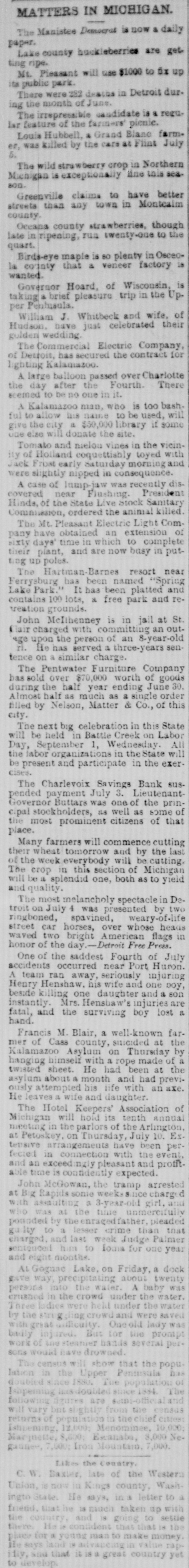 MATTERS IN MICHIGAN. The Manistee Democrat is now a daily paper. Lake county hackleberries are get ting ripe. Mt. Pleasant will use $1000 to 6% up its public park. There were 282 deaths in Detroit dur. ing the month of June. The irrepressible candidate is a regular feature of the farmers' pienie. Louis Hubbell, a Grand Blane farm. er, was killed by the care at Flint July 5. The wild strawberry crop in Northern Michigan is exceptionally fine this sea800. Greenville claims to have better streets than any town in Montealm county. Oceana county strawberries, though late in ripening, rua twenty-one to the quart. Birds-eye maple is so plenty in Osceo is la county that a veneer factory wanted. Governor Hoard, of Wisconsin, is taking a brief pleasure trip in the Upper Penhaula. William J. Whitbeck and wife, of Hudaon. have just celebrated their gulden wedding. The Commercial Electric Company, of Detroit, has secured the contract for lighting Kalamazoo. A. large balloon passed over Charlotte the day after the Fourth There seemed to be no one in it. A Kalamazoo man, who is too bash ful allow 11:8 name to be used, will give the city a $50,000 library if some one e.se will donate the site. Tomato and nielou vines in the vicinity of Holland coquettiably toyed with Jack Frisatearly Saturday morning and were slightly nipped in consequence. A case of lump-jaw was recently discovered near Flushing. President Hinds, of the State Live Stock Sanitary Commission, ordered the animal killed. The Mt. Pleasant Electric Light Company have obtained an extension of rixty days time in which to complete their plant, and are now basy in putting up poles. The Hartman-Barnes resort near Ferrysburg has been named "Spring Lake Park." It has been platted and contains 100 lots, a free park and retreation grounds. John McIthenney is in jail at St. I air charged with committing an outage upon the person of an 8-year-old rl. He has served a three-years sen tence on similar charge. The Pentwater Furniture Company bas sold over $70,000 worth of goods during the half year ending June 30. Almost half as much as a single order filled by Nelson, Matter & Co., of this city. The next big celebration in this State will be held in Battle Creek on Labor All Day, September 1, Wednesday. the labor organizations in the State will be present and participate in the exer cises. The Charlevoix Savings Bank suspended payment July 3. LieutenantGovernor Buttars was one of the principal stockholders, as well as some of the most prominent citizens of that place. Many farmers will commence cutting their wheat tomorrow and by the last of the week everybody will be cutting The crop in this section of Michigan will be a splendid one, both as to yield and quality. The most melancholy spectacle in De troit on July 4 was presented by two ringboned, spavined, weary-of-life street car horses, over whose heads waved two bright American flags in honor of the day. Detroit Free Press. One of the saddest Fourth of July accidents occurred near Port Huron. A team ran away, seriously injuring Henry Henshaw. his wife and one boy, beside killing one daughter and a son instantly. Mrs. Henshaw's injuries are a fatal, and the surviving boy lost hand. Francis M. Blair, a well-known far mer of Cass county, suicided at the Kalamazoo Asylum on Thursday by hanging himself with a rope made of a twisted sheet. He had been at the asylum about a month and had previously attempted his life with an axe. Heleaves a wife and daughter. The Hotel Keepers' Association of Michigan will hold its tenth annual meeting in the parlors of the Arlington at Petoskey, on Thursday, July 10. Ex. tensive arrangements have been perfected in connection with the event and an exceed engly pleasant and profitable time is confidently expected. John McGowan, the tramp arrested at Big Rapids some weeks nce charge d with assaulting a 3-year-old girl, and who was at the time unmereifull ponaded by theonraged father, pleaded guilty to a lesser crime than that charged. and last week Judge Palmer sentenced him to Ioma for one year and eight months AL Gognac Lake, on Friday, a dock give way, precipitating about twenty persons into the water. A baby was crushed in the crowd under the water. Three ladies were held under the water by the strug ling crowd and were saved great utiliculty. Queold lady was baily injured. But for the promp work of the steatuer bands several per sons would have drowned The census will store that the popu lation in the Upper Peninsula has doubled since 1880. The population of Ishpeming double since 1334. The are vary but from the returns of populatic ain the nief cities: Islivening 12,000; Menominee, 10,000 Marjnette, 8,600 Estanaba, 8,000 Ne granes, 7,000; Iron Mountain 7,000. Likes the Country C.W. Basier, late of the Wester Union, 16 now in Kings county, Wash a ingto State He says, in a letter to friend. that he is mach taken up with the country, and is going to settle there. He confident that that the place for a young man to make money says in value rapiily and that 16 is a greas country yet