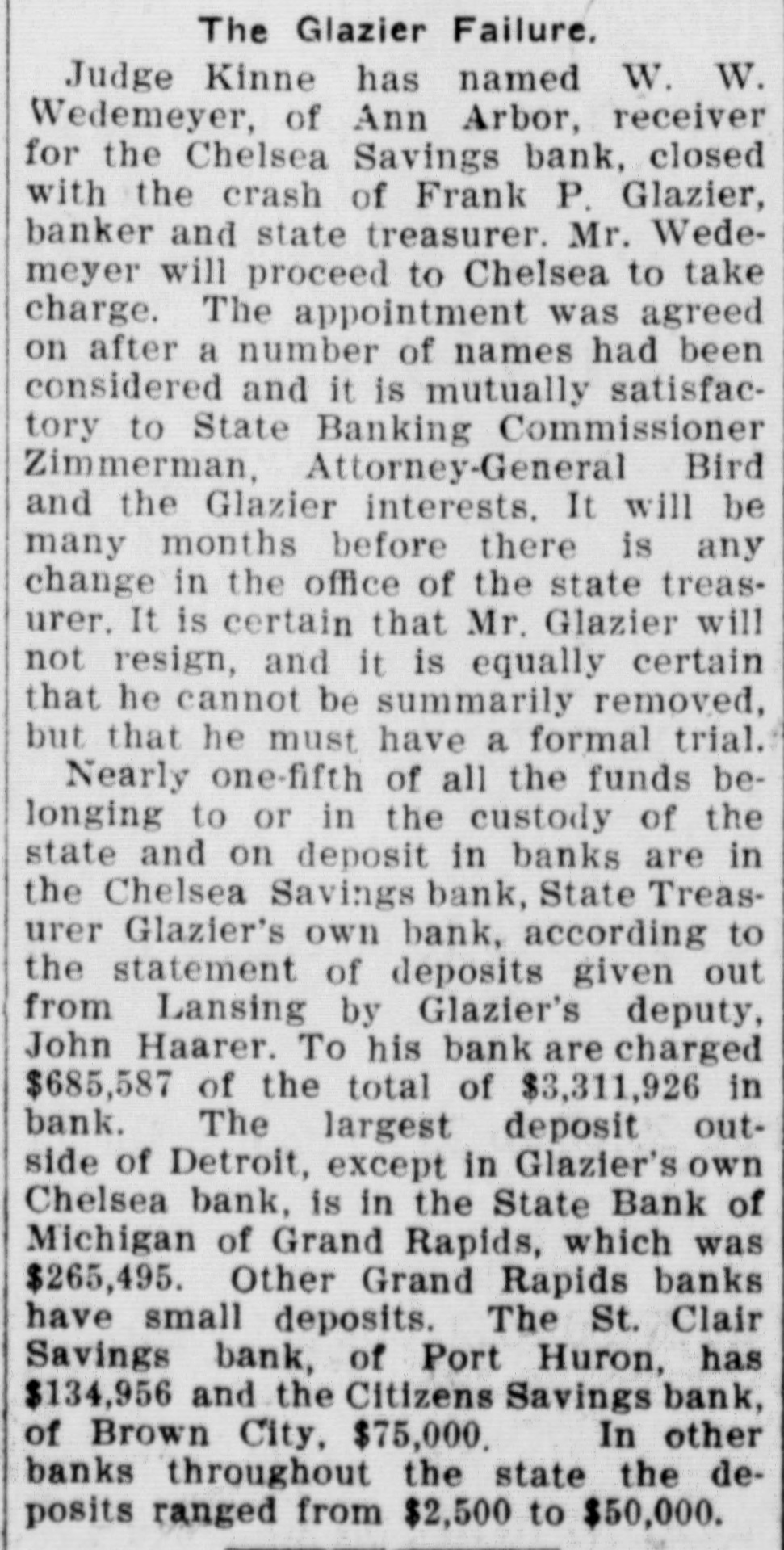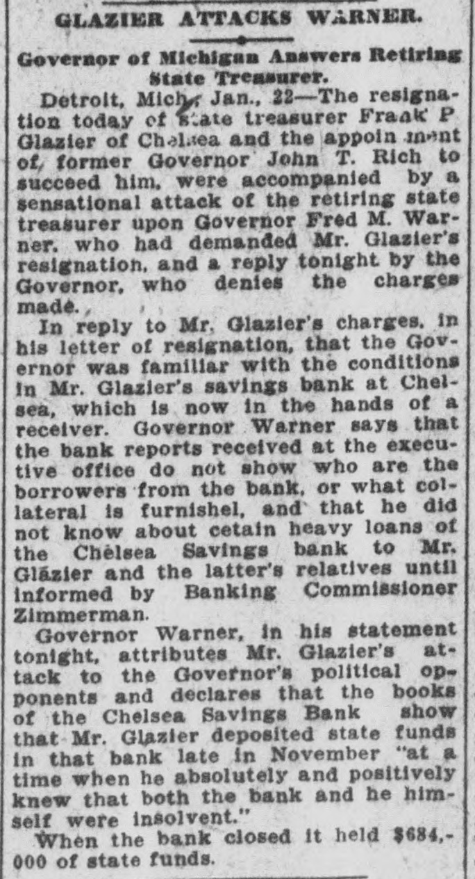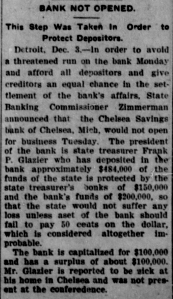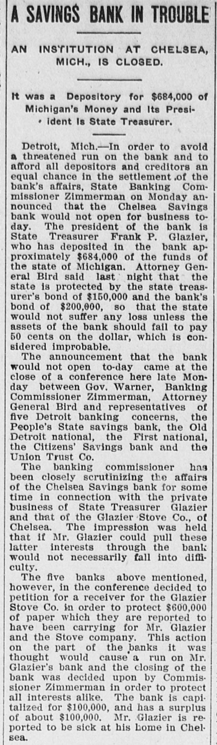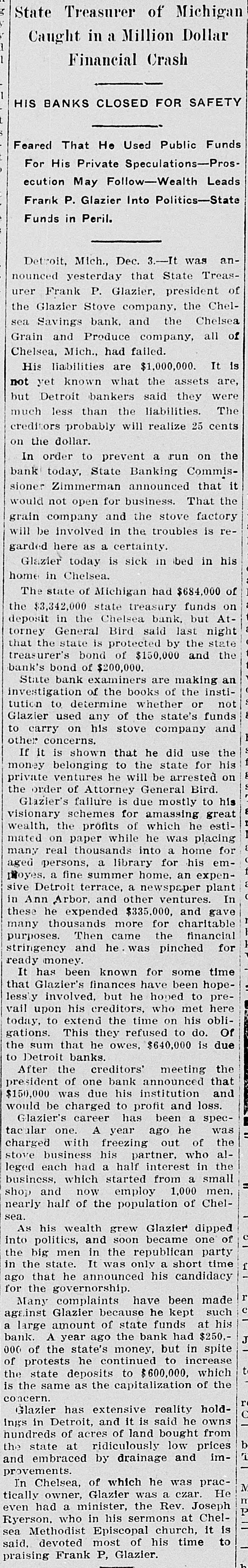 O d MICHIGAN BANK S. II. e WILL NOT OPEN e, e 1FOR BUSINESS TODAY-STATE BANK COMMISSIONER HAS ANNOUNCED. THE PRIVATE BUSINESS Of State Treasurer Glazier Has Been Scrutinized-Detroit Bankers Asked For a Receiver For Glazier Stove Company. Detroit, Mich., Dec. 2.-State Bank ing Commissioner Zimmerman has announced that the Chelsea, Mich., savings bank. of which State Treas urer Frank P. Glazier is president and which has $684,000 state funds on deposit, will not open for business tomorrow and will be taken in charge by the banking commissioner. Attorney General Bird said tonight that the state is protected by the state treasurer's bond of $150,000 and the bank's bond of $200,000, so that the state would not suffer any loss unless the assets of the bank should fail to pay fifty cents on the dollar which is considered altogether im probable. The announcement that the bank will not open tomorrow came at the close of a conference here today be^ween Governor Warner, Banking Commissioner Zimmerman. Attorney General Bird and representatives of five Detroit banks. It is stated that the banking comS missioner has been closely serutinizing the affairs of the Chelsea Savings bank for some time in connection with the private business of State Treasurer Glazie, and that of the e Glazier Stove company of Chelsea, h The impression was held that if a Glazier could pull the latter interests n through the bank would not necesarily fall into diffeulties. re The Detroit banks. however, in to. filay's conference, announced the deision to petition for a receiver for ti the stove company in order to protect hi approximately $600,000 paper which via they are reported to have been carrybe ing for Glazier and the stove comth bany. This action on the part of the H banks. it was thought, would cause a lo run on Glazier's bank tomorrow. and ov the closing of the bank wac decided upon. The bank is capitalized at A $100,000. Glazier is reported sick at ba his home in Chelsea. Bu Governor Warner tonight said it wl was probable the "differences be ne tween the amount of Glazier's bonds an and the amount of the state funds on loc deposit with the Chelsea Savings bank would be more than made up by bu the amount the state will be entitled ba to receive on liquidation of the bank: un so. as the matter now looks, the state mi suffers no loss." be The Chelsea Steve Works has issued $500.000 preferred and $1,000. 000 common stock. Its buildings and Fl plant are valued at $300,000 and the schedule of assets submitted today gives bills receivable $51,000. Gross earnings have been averaging $400. 000 a year and the bankers regard the stove plant as a solvent institution.