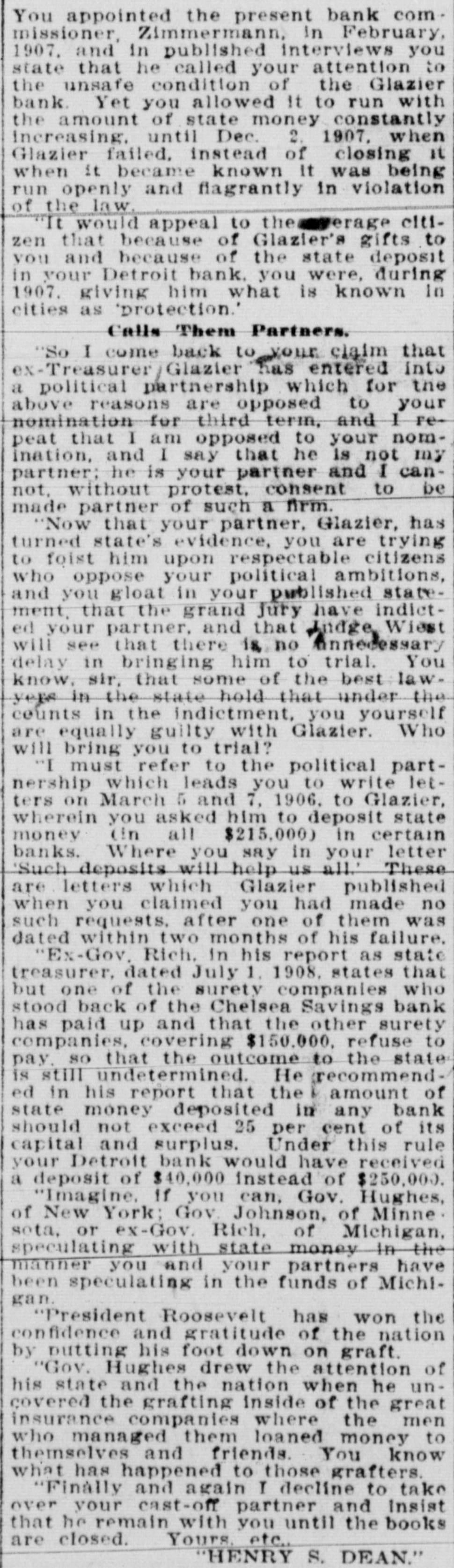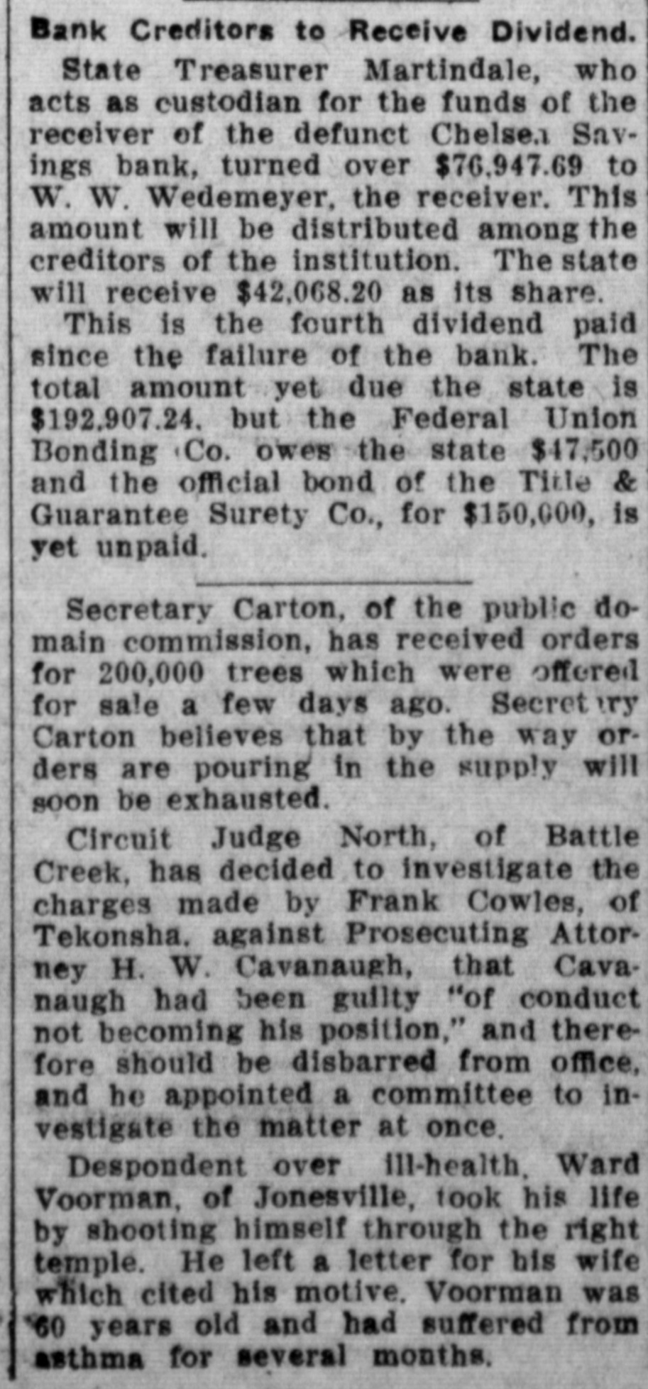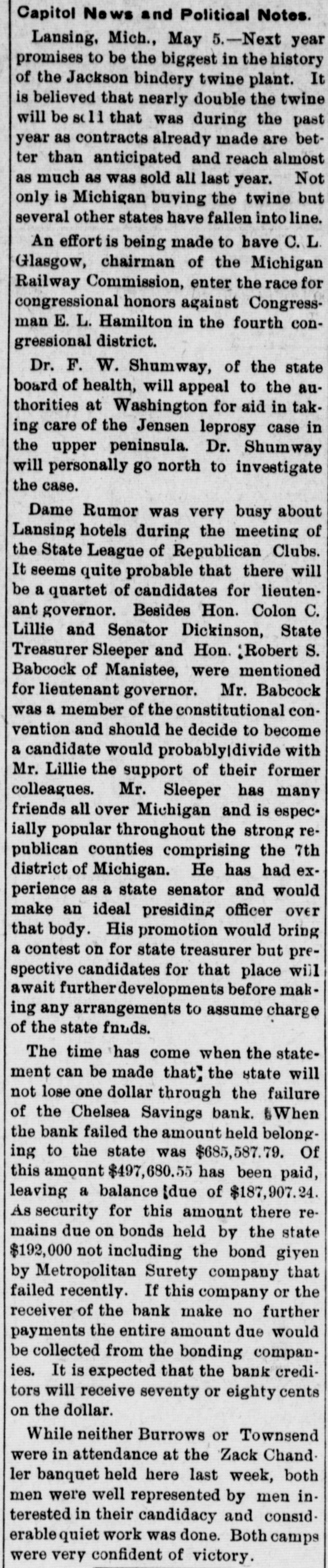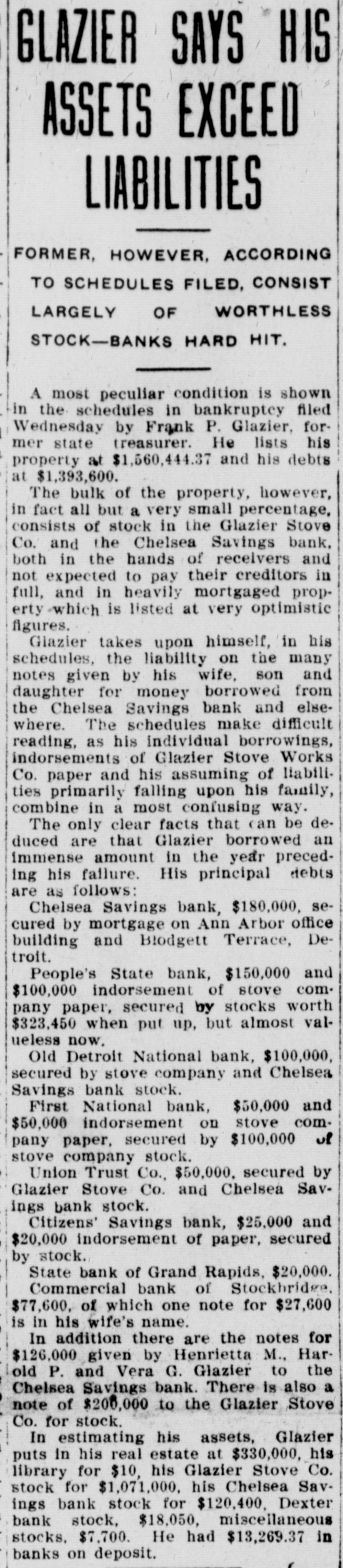 O d MICHIGAN BANK S. II. e WILL NOT OPEN e, e 1FOR BUSINESS TODAY-STATE BANK COMMISSIONER HAS ANNOUNCED. THE PRIVATE BUSINESS Of State Treasurer Glazier Has Been Scrutinized-Detroit Bankers Asked For a Receiver For Glazier Stove Company. Detroit, Mich., Dec. 2.-State Bank ing Commissioner Zimmerman has announced that the Chelsea, Mich., savings bank. of which State Treas urer Frank P. Glazier is president and which has $684,000 state funds on deposit, will not open for business tomorrow and will be taken in charge by the banking commissioner. Attorney General Bird said tonight that the state is protected by the state treasurer's bond of $150,000 and the bank's bond of $200,000, so that the state would not suffer any loss unless the assets of the bank should fail to pay fifty cents on the dollar which is considered altogether im probable. The announcement that the bank will not open tomorrow came at the close of a conference here today be^ween Governor Warner, Banking Commissioner Zimmerman. Attorney General Bird and representatives of five Detroit banks. It is stated that the banking comS missioner has been closely serutinizing the affairs of the Chelsea Savings bank for some time in connection with the private business of State Treasurer Glazie, and that of the e Glazier Stove company of Chelsea, h The impression was held that if a Glazier could pull the latter interests n through the bank would not necesarily fall into diffeulties. re The Detroit banks. however, in to. filay's conference, announced the deision to petition for a receiver for ti the stove company in order to protect hi approximately $600,000 paper which via they are reported to have been carrybe ing for Glazier and the stove comth bany. This action on the part of the H banks. it was thought, would cause a lo run on Glazier's bank tomorrow. and ov the closing of the bank wac decided upon. The bank is capitalized at A $100,000. Glazier is reported sick at ba his home in Chelsea. Bu Governor Warner tonight said it wl was probable the "differences be ne tween the amount of Glazier's bonds an and the amount of the state funds on loc deposit with the Chelsea Savings bank would be more than made up by bu the amount the state will be entitled ba to receive on liquidation of the bank: un so. as the matter now looks, the state mi suffers no loss." be The Chelsea Steve Works has issued $500.000 preferred and $1,000. 000 common stock. Its buildings and Fl plant are valued at $300,000 and the schedule of assets submitted today gives bills receivable $51,000. Gross earnings have been averaging $400. 000 a year and the bankers regard the stove plant as a solvent institution.
