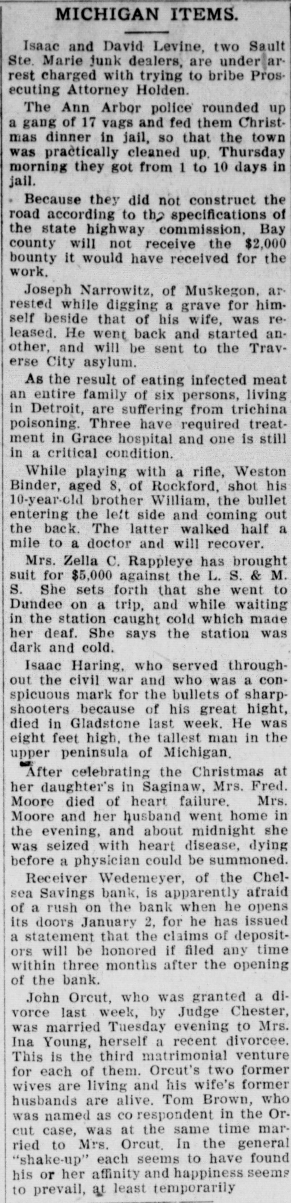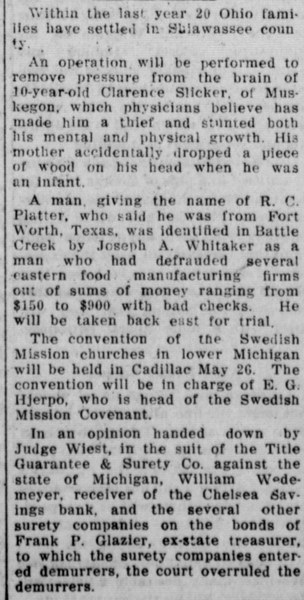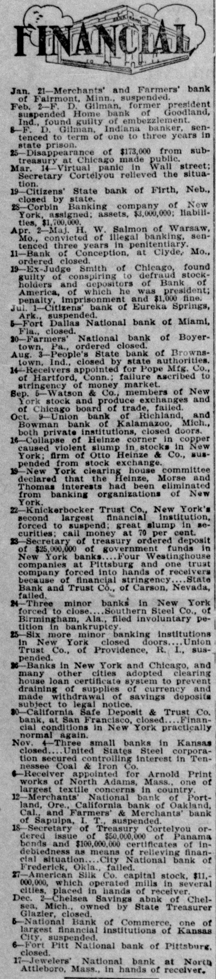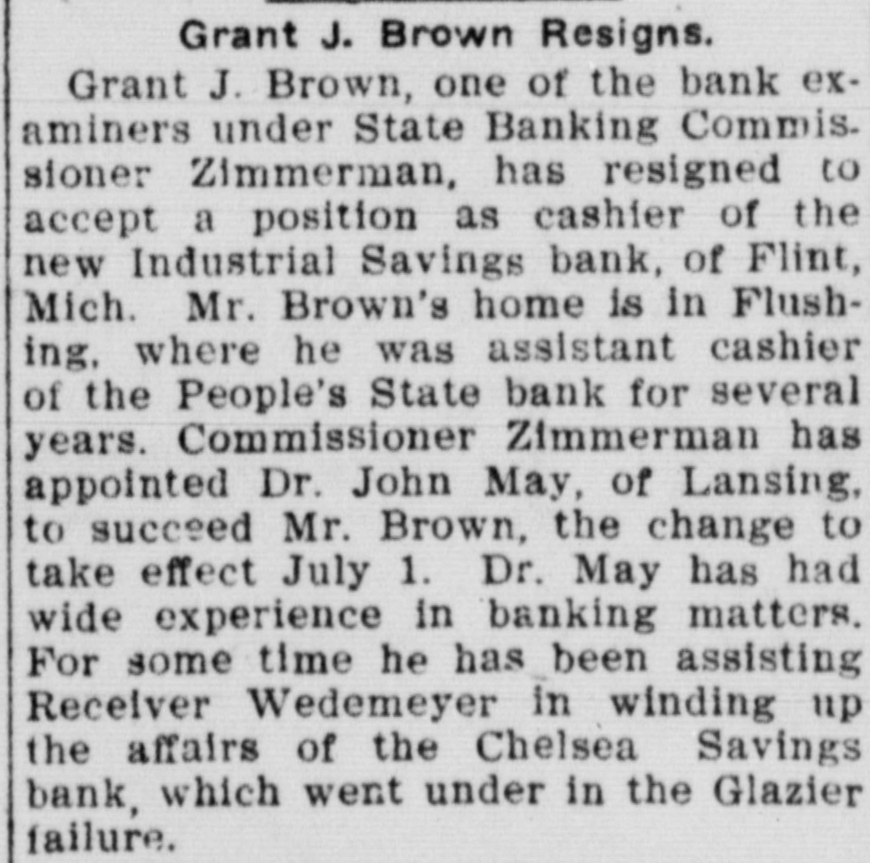 O d MICHIGAN BANK S. II. e WILL NOT OPEN e, e 1FOR BUSINESS TODAY-STATE BANK COMMISSIONER HAS ANNOUNCED. THE PRIVATE BUSINESS Of State Treasurer Glazier Has Been Scrutinized-Detroit Bankers Asked For a Receiver For Glazier Stove Company. Detroit, Mich., Dec. 2.-State Bank ing Commissioner Zimmerman has announced that the Chelsea, Mich., savings bank. of which State Treas urer Frank P. Glazier is president and which has $684,000 state funds on deposit, will not open for business tomorrow and will be taken in charge by the banking commissioner. Attorney General Bird said tonight that the state is protected by the state treasurer's bond of $150,000 and the bank's bond of $200,000, so that the state would not suffer any loss unless the assets of the bank should fail to pay fifty cents on the dollar which is considered altogether im probable. The announcement that the bank will not open tomorrow came at the close of a conference here today be^ween Governor Warner, Banking Commissioner Zimmerman. Attorney General Bird and representatives of five Detroit banks. It is stated that the banking comS missioner has been closely serutinizing the affairs of the Chelsea Savings bank for some time in connection with the private business of State Treasurer Glazie, and that of the e Glazier Stove company of Chelsea, h The impression was held that if a Glazier could pull the latter interests n through the bank would not necesarily fall into diffeulties. re The Detroit banks. however, in to. filay's conference, announced the deision to petition for a receiver for ti the stove company in order to protect hi approximately $600,000 paper which via they are reported to have been carrybe ing for Glazier and the stove comth bany. This action on the part of the H banks. it was thought, would cause a lo run on Glazier's bank tomorrow. and ov the closing of the bank wac decided upon. The bank is capitalized at A $100,000. Glazier is reported sick at ba his home in Chelsea. Bu Governor Warner tonight said it wl was probable the "differences be ne tween the amount of Glazier's bonds an and the amount of the state funds on loc deposit with the Chelsea Savings bank would be more than made up by bu the amount the state will be entitled ba to receive on liquidation of the bank: un so. as the matter now looks, the state mi suffers no loss." be The Chelsea Steve Works has issued $500.000 preferred and $1,000. 000 common stock. Its buildings and Fl plant are valued at $300,000 and the schedule of assets submitted today gives bills receivable $51,000. Gross earnings have been averaging $400. 000 a year and the bankers regard the stove plant as a solvent institution.