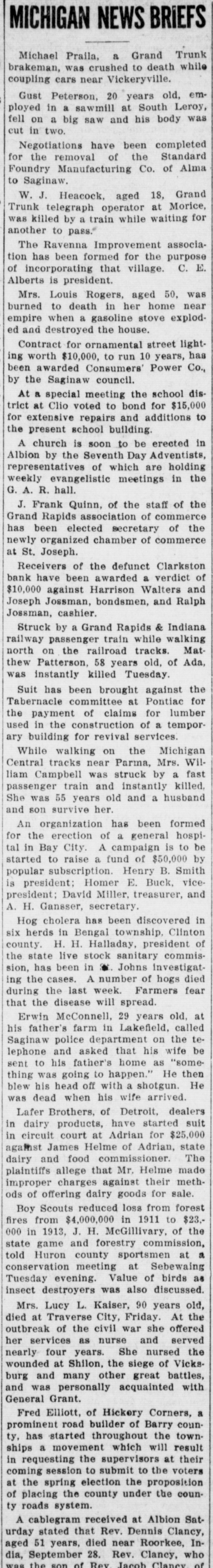 # MICHIGAN NEWS BRIEFS Michael Praila, a Grand Trunk brakeman, was crushed to death while coupling cars near Vickeryville. Gust Peterson, 20 years old, employed in a sawmill at South Leroy, fell on a big saw and his body was cut in two. Negotiations have been completed for the removal of the Standard Foundry Manufacturing Co. of Alma to Saginaw. W. J. Heacock, aged 18, Grand Trunk telegraph operator at Morice, was killed by a train while waiting for another to pass. The Ravenna Improvement association has been formed for the purpose of incorporating that village. C. E. Alberts is president. Mrs. Louis Rogers, aged 50, was burned to death in her home near empire when a gasoline stove exploded and destroyed the house. Contract for ornamental street lighting worth $10,000, to run 10 years, has been awarded Consumers' Power Co., by the Saginaw council. At a special meeting the school district at Clio voted to bond for $15,000 for extensive repairs and additions to the present school building. A church is soon to be erected in Albion by the Seventh Day Adventists, representatives of which are holding weekly evangelistic meetings in the G. A. R. hall. J. Frank Quinn, of the staff of the Grand Rapids association of commerce has been elected secretary of the newly organized chamber of commerce at St. Joseph. Receivers of the defunct Clarkston bank have been awarded a verdict of $10,000 against Harrison Walters and Joseph Jossman, bondsmen, and Ralph Jossman, cashier. Struck by a Grand Rapids & Indiana railway passenger train while walking north on the railroad tracks. Matthew Patterson, 58 years old, of Ada, was instantly killed Tuesday. Suit has been brought against the Tabernacle committee at Pontiac for the payment of claims for lumber used in the construction of a temporary building for revival services. While walking on the Michigan Central tracks near Parma, Mrs. William Campbell was struck by a fast passenger train and instantly killed. She was 55 years old and a husband and son survive her. An organization has been formed for the erection of a general hospital in Bay City. A campaign is to be started to raise a fund of $50,000 by popular subscription. Henry B. Smith is president; Homer E. Buck, vice-president; David Miller, treasurer, and A. H. Gansser, secretary. Hog cholera has been discovered in six herds in Bengal township, Clinton county. H. H. Halladay, president of the state live stock sanitary commission, has been in St. Johns investigating the cases. A number of hogs died during the last week. Farmers fear that the disease will spread. Erwin McConnell, 29 years old, at his father's farm in Lakefield, called Saginaw police department on the telephone and asked that his wife be sent to his father's home as "something was going to happen." He then blew his head off with a shotgun. He was dead when his wife arrived. Lafer Brothers, of Detroit, dealers in dairy products, have started suit in circuit court at Adrian for $25,000 against James Helme of Adrian, state dairy and food commissioner. The plaintiffs allege that Mr. Helme made improper charges against their methods of offering dairy goods for sale. Boy Scouts reduced loss from forest fires from $4,000,000 in 1911 to $23,000 in 1913, J. H. McGillivary, of the state game and forestry commission, told Huron county sportsmen at a conservation meeting at Sebewaing Tuesday evening. Value of birds as insect destroyers was also discussed. Mrs. Lucy L. Kaiser, 90 years old, died at Traverse City, Friday. At the outbreak of the civil war she offered her services as nurse and served nearly four years. She nursed the wounded at Shilon, the siege of Vicksburg and many other great battles, and was personally acquainted with General Grant. Fred Elliott, of Hickory Corners, a prominent road builder of Barry county, has started throughout the townships a movement which will result in requesting the supervisors at their coming session to submit to the voters at the spring election the proposition of placing the county under the county roads system. A cablegram received at Albion Saturday stated that Rev. Dennis Clancy, aged 51 years, died near Roorkee, India, September 28. Rev. Clancy, who was the son of Rey Jacob Clancy of