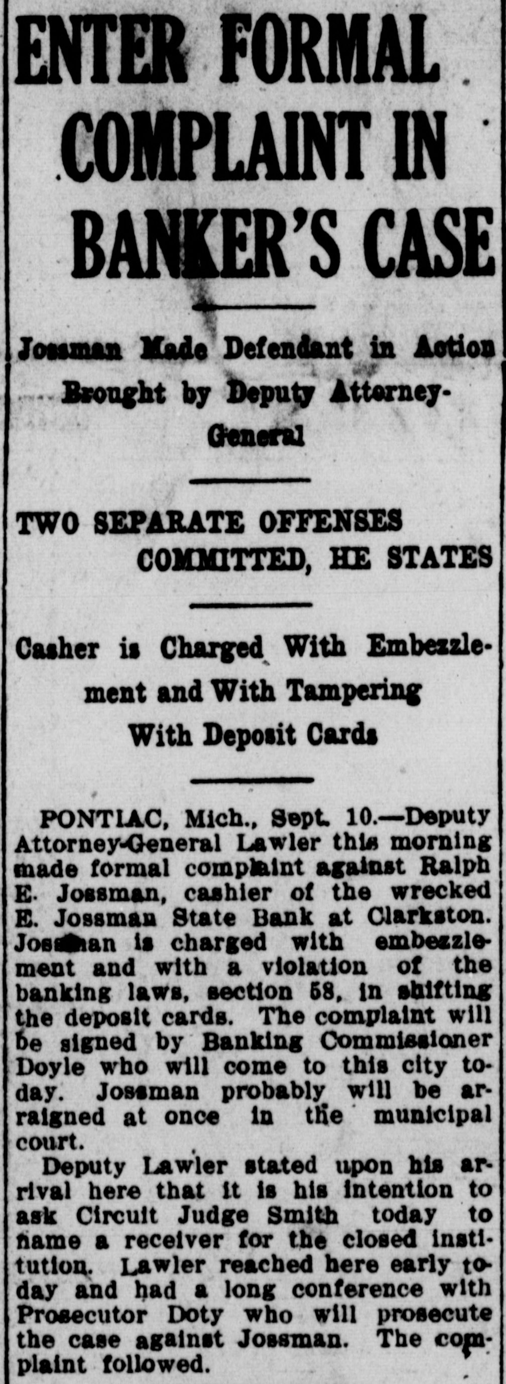 ENTER FORMAL COMPLAINT IN BANKER'S CASE Jossman Made Defendant in Action Brought by Deputy AttorneyGeneral TWO SEPARATE OFFENSES COMMITTED, HE STATES Casher is Charged With Embezzlement and With Tampering With Deposit Cards PONTIAC, Mich., Sept. 10.-Deputy Attorney-General Lawler this morning made formal complaint against Ralph E. Jossman, cashier of the wrecked E. Jossman State Bank at Clarkston. Jossiman is charged with embezzlement and with a violation of the banking laws, section 58, in shifting the deposit cards. The complaint will be signed by Banking Commissioner Doyle who will come to this city today. Joseman probably will be arraigned at once in the municipal court. Deputy Lawler stated upon his arrival here that it is his intention to ask Circuit Judge Smith today to name a receiver for the closed institution. Lawler reached here early to day and had a long conference with Prosecutor Doty who will prosecute the case against Jossman. The complaint followed.