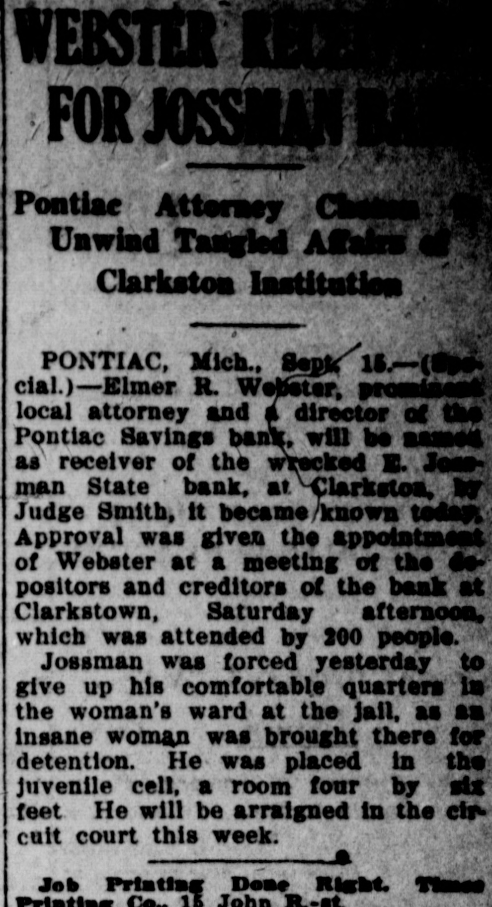 WEBSTE FOR JOSS Pontiac Attorney Unwind Tangled Affairs Clarkston Institution PONTIAC, Mich., Sept. cial.)-Elmer R. Webster, local attorney and director of Pontiac Savings bank, will be named as receiver of the wrecked E. Joseman State bank, at Clarkston, by Judge Smith, it became/known today, Approval was given the appointment of Webster at a meeting of the w positors and creditors of the bank at Clarkstown, Saturday afternoon, which was attended by 200 people. Jossman was forced yesterday to give up his comfortable quarters in the woman's ward at the jail, as an insane woman was brought there for detention. He was placed in the juvenile cell, a room four by six feet He will be arraigned in the circuit court this week. Job Printing Done Right. Printing Co., 15 John R-st.