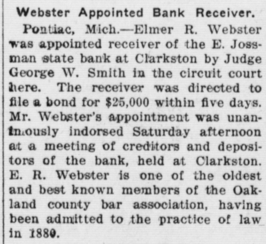 Webster Appointed Bank Receiver. Pontiac, Mich.-Elmer R. Webster was appointed receiver of the E. Jossman state bank at Clarkston by Judge George W. Smith in the circuit court here. The receiver was directed to file a bond for $25,000 within five days. Mr. Webster's appointment was unantmously indorsed Saturday afternoon at a meeting of creditors and depositors of the bank, held at Clarkston. E. R. Webster is one of the oldest and best known members of the Oakland county bar association, having been admitted to the practice of law in 1880.