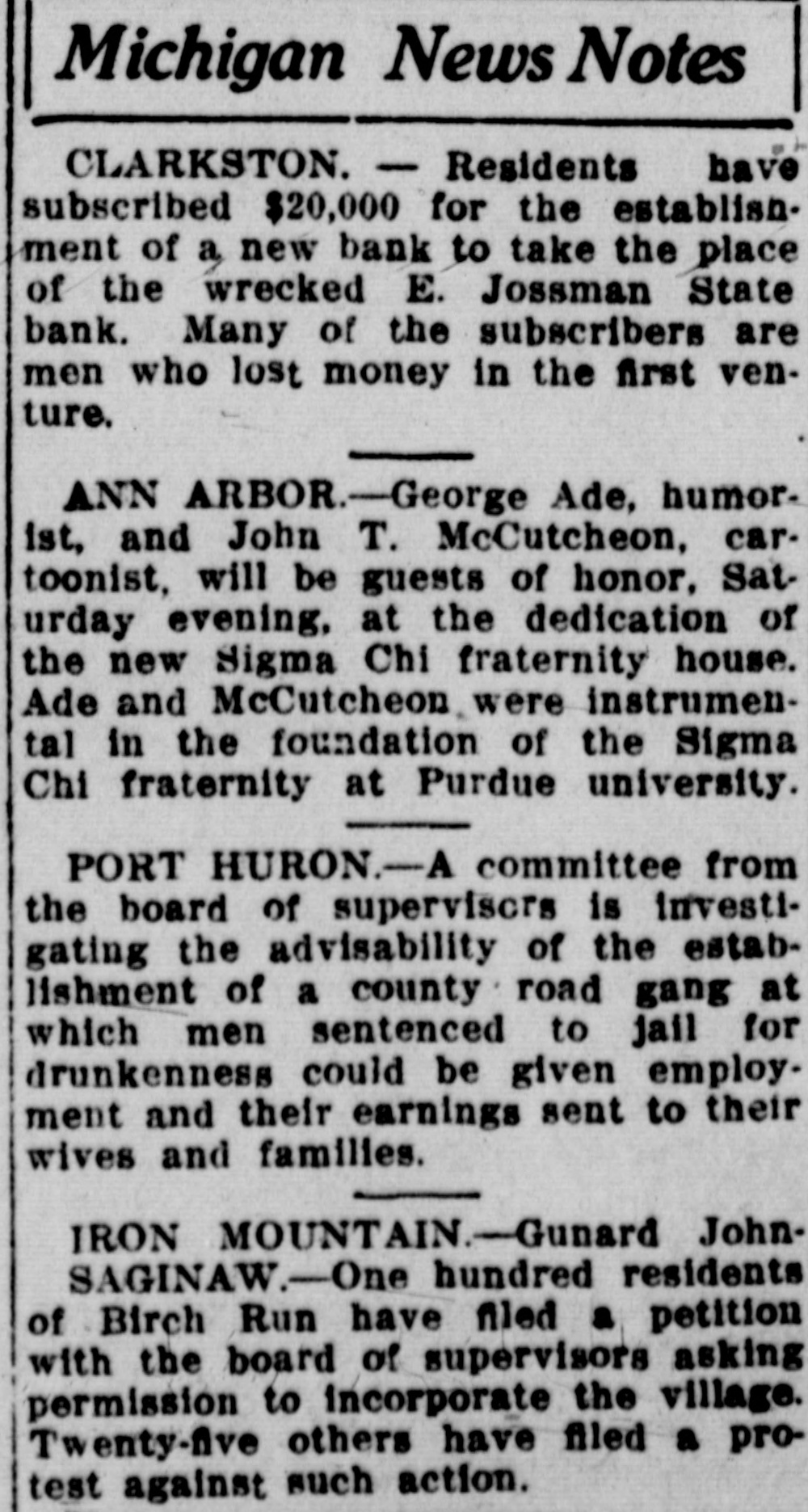 Michigan News Notes CLARKSTON. - Residents have subscribed $20,000 for the establishment of a new bank to take the place of the wrecked E. Jossman State bank. Many of the subscribers are men who lost money in the first venture. ANN ARBOR.-George Ade, humorist, and John T. McCutcheon, cartoonist, will be guests of honor, Saturday evening, at the dedication of the new Sigma Chi fraternity house. Ade and McCutcheon were instrumental in the foundation of the Sigma Chi fraternity at Purdue university. PORT HURON.-A committee from the board of supervisors is investigating the advisability of the establishment of a county road gang at which men sentenced to jail for drunkenness could be given employment and their earnings sent to their wives and families. IRON MOUNTAIN-Gunard JohnSAGINAW.-One hundred residents of Birch Run have filed a petition with the board of supervisors asking permission to incorporate the village. Twenty-five others have filed a protest against such action.