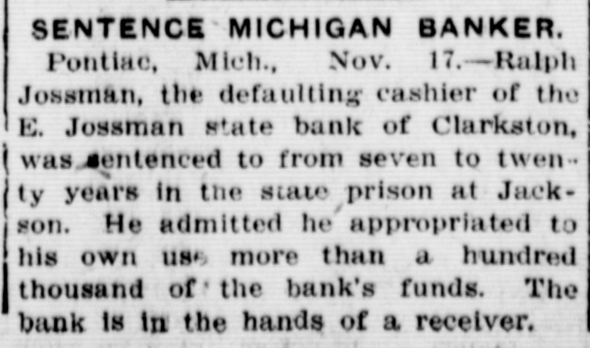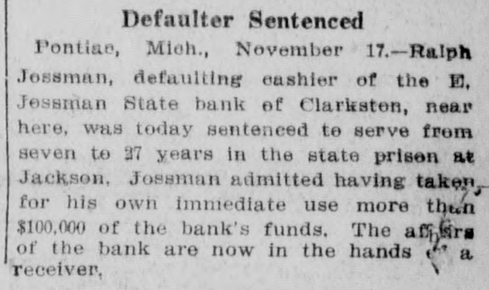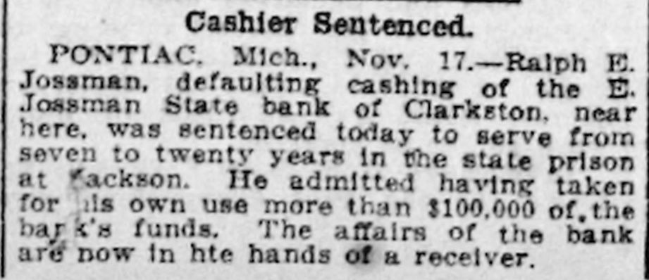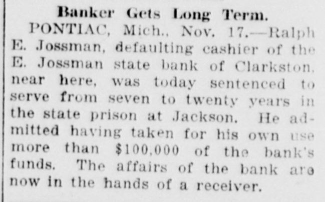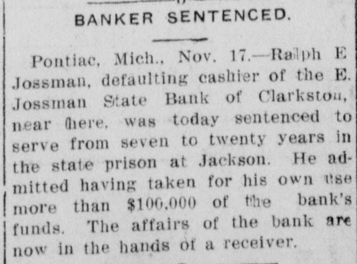 Banker Gets Long Term. PONTIAC, Mich., Nov. 17.-Ralph E. Jossman, defaulting cashier of the E. Jossman state bank of Clarkston. near here, was today sentenced to serve from seven to twenty years in the state prison at Jackson. He admitted having taken for his own use more than $100,000 of the bank's funds. The affairs of the bank are now in the hands of a receiver.