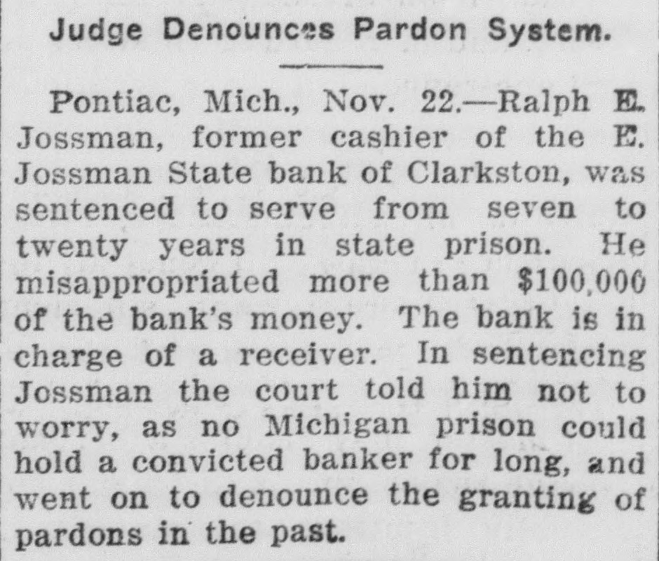 Judge Denounces Pardon System. Pontiac, Mich., Nov. 22.-Ralph E. Jossman, former cashier of the E. Jossman State bank of Clarkston, was sentenced to serve from seven to twenty years in state prison. He misappropriated more than $100,000 of the bank's money. The bank is in charge of a receiver. In sentencing Jossman the court told him not to worry, as no Michigan prison could hold a convicted banker for long, and went on to denounce the granting of pardons in the past.