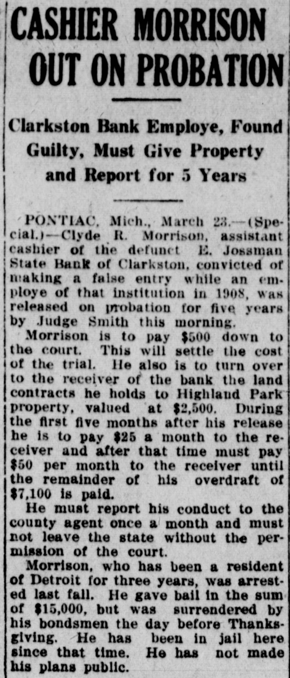 PONTIAC, Mich., March 23.-(Special.)-Clyde R. Morrison, assistant cashier of the defunct E. Jossman State Bank of Clarkston, convicted of making a false entry while an employe of that institution in 1908, was released on probation for five years by Judge Smith this morning.
