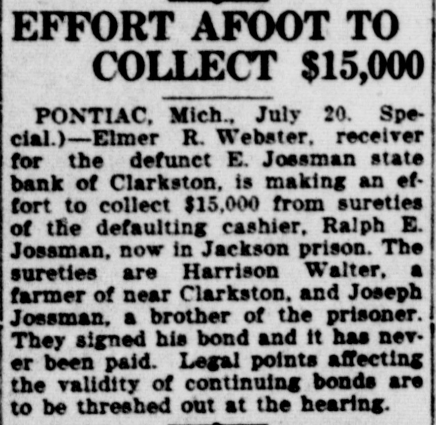 EFFORT AFOOT TO COLLECT $15,000 PONTIAC, Mich., July 20. Special.)-Elmer R. Webster, receiver for the defunct E. Jossman state bank of Clarkston, is making an effort to collect $15,000 from sureties of the defaulting cashier, Ralph E. Jossman, now in Jackson prison. The sureties are Harrison Walter, a farmer of near Clarkston. and Joseph Jossman, a brother of the prisoner. They signed his bond and it has never been paid. Legal points affecting the validity of continuing bonds are to be threshed out at the hearing.