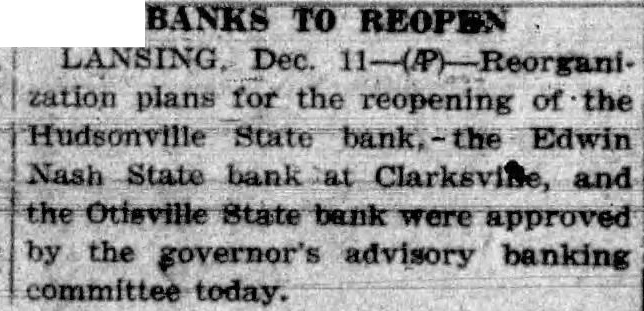 LANSING. Dec. zation plans for the reopening of the State Edwin Nash State bank Clarksvine, the Otisville State bank were approved by the governor's advisory banking committee today.
