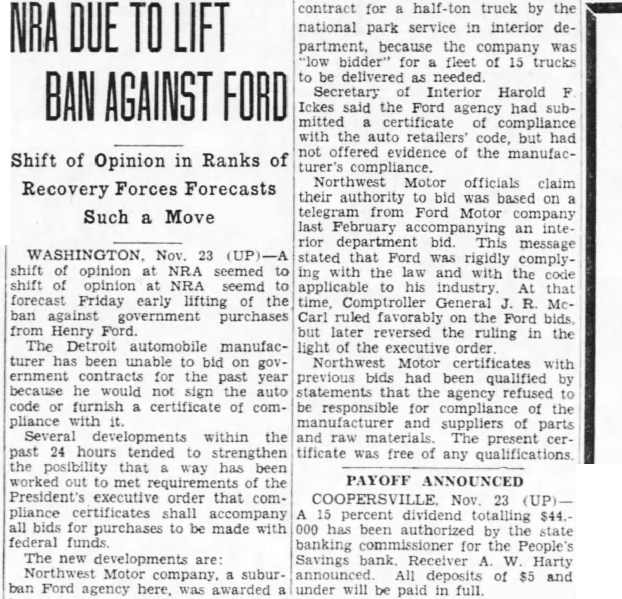 DUE BAN AGAINST FORD Shift of Opinion in Ranks of Recovery Forces Forecasts Such Move WASHINGTON, Nov. 23 (UP)-A shift of opinion at NRA seemed to shift of opinion at NRA seemd to forecast Friday early lifting of the ban against government purchases from Henry Ford. The Detroit automobile manufacturer has been unable to bid on government contracts for the past year because he would not sign the auto code or furnish certificate of compliance with it. Several developments within the past 24 hours tended to strengthen the posibility that way has been worked out to met requirements of the President's executive order that compliance certificates shall accompany all bids for purchases to be made with federal funds The new developments are: Northwest Motor company, suburban Ford agency here, was awarded a contract for a half-ton truck by the national park service in interior department, because the company was "low bidder' for fleet of 15 trucks to be delivered as needed. Secretary of Interior Harold F Ickes said the Ford agency had submitted certificate of compliance with the auto retailers' code, but had not offered evidence of the manufacturer's compliance. Northwest Motor officials claim their authority to bid was based on a telegram from Ford Motor company last February an interior department bid. This message stated that Ford was rigidly complying with the law and with the code applicable to his industry At that time, Comptroller General J. R McCarl ruled favorably on the Ford bids, but later reversed the ruling in the light of the executive order Northwest Motor certificates with previous bids had been qualified by statements that the agency refused to be responsible for compliance of the manufacturer and suppliers of parts and raw materials The present certificate was free of any qualifications. PAYOFF ANNOUNCED COOPERSVILLE Nov. 23 (UP)A 15 percent dividend totalling $44, 000 has been authorized by the state banking commissioner for the People's Savings bank Receiver A. W. Harty announced. All deposits of $5 and under will be paid in full.