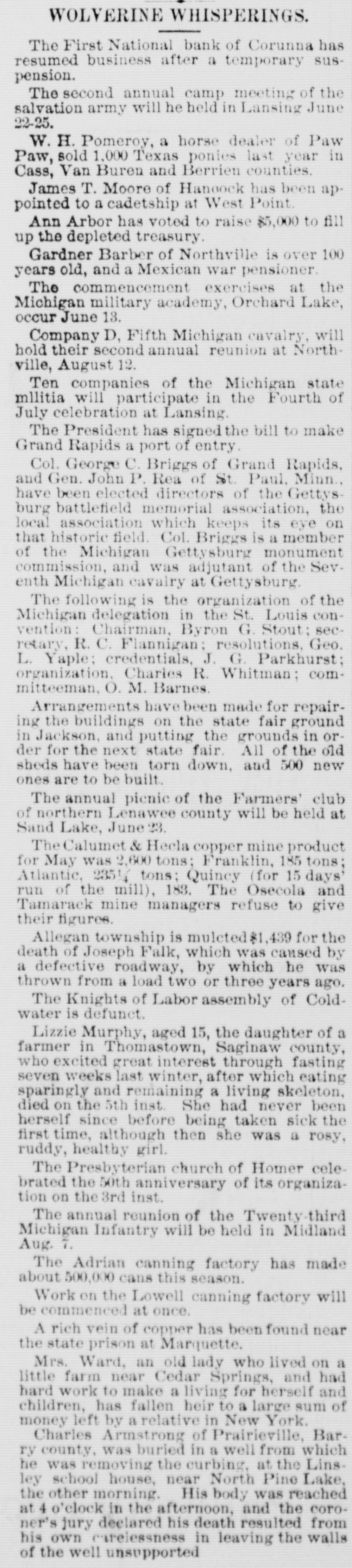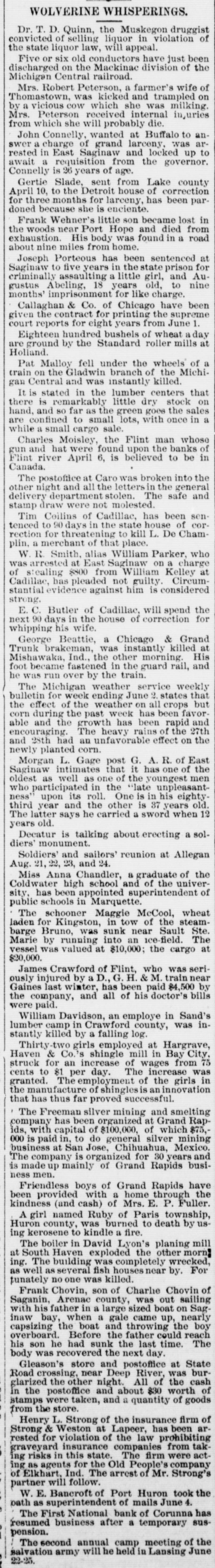 WOLVERINE WHISPERINGS. druggist Dr. T. liquor D. Quinn, the Muskegon in violation the convicted state liquor of selling law, will appeal. have just of the Michigan dischargecontral farmer's Five or six on old the conductors Mackinac railroad. division wife of Mrs. Robert was Peterson, kicked and was trampled on milking by a received die. Thomastown vicious cow which she internal injuries Mrs. Peterson will probably from which she wanted at Buffalo was to an- arJohn Connelly, of grand and larceny, locked up to swer rested a in charge East requisition Saginaw from the governor. await a is 26 years of age. Lake county Connelly Slade, sent from house of correction par10, months for enciente. for April Gertie three to the she Detroit is larceny, has been lost in because became doned Wehner's little Hope son and died from road the Frank woods near His Port body was found in a at exhaustion nine miles from home. been sentenced about Joseph Porteous years has in the state prison and Au- for Saginaw to assaulting five years little girl, old, to nine Chicago gustus criminally imprisonment Abeling, 18 for like charge. have been months' Callaghan & Co. for of printing from the June 1 supreme given reports the contract for eight years of wheat aday by ground court Eighteen hundred the Standard bushels roller mills at of a wheels are Holland. Malloy fell under branch the of the MichiPat on the Gladwin instantly killed. Central lumber on hand, crain gan stated and in was the little dry centers stock that to It is remarkably goes the sales there and is 80 far as small the green lots, with once in gun are while confined a small cargo sale. the Flint the man banks whose of river Flint April Charles and hat Moisley, were 6, found is believed upon to be in into the broken Canada. other The night postoffice and all at Caro the stolen. letters was The in the safe general and delivery department not molested. sendraw were has been stamp Coilins of Cadillac, the state house of Cham- cortenced Tim to 90 for threater days in that to place. kill L. De who arrested rection a merchant of William Parker, charge from plin, W R Smith. at East alias Saginaw William on Kelley a at Circum: evidence of Cadillac, was stealing has 8800 pleaded against not him guilty is considered the stantial strong E. C. 90 days Butler in the of house Cadillac, of correction will spend Grand for whipping next his wife. a Chicago & killed at George brakeman, Beattie, was other instantly morning; and His Mishawaka, Trunk fastened Ind., the in the guard rail, foot became over by the train. service weekly he was Michigan run weather ending June states crops that but bulletin for the weather has been favorThe effect of week past week on all rapid and corn the during the growth has rains been of the 27th had able encouraging. and the The an unfavorable heavy effect on the East and newly 28th planted corn. post G. A. R. of of the intimates one of the Saginaw Morgan well L. Gage as that the late it has youngest unpleasant one eighty men oldest participated as in One is in his years old. says years ness who third year upon and its he the roll. carried other a is sword 37 when 12 solThe latter old. is talking about erecting a Soldiers' 24. diers' Decatur monument. and sailors' reunion at Allegan the Aug. 21, 22, 23, Chandler, and a graduate of the univer- of Coldwater Miss Anna high pointed school Ruperintendent of sity, has been in Marquette. wheat public schools schooner Maggie tow McCool, of the steam- Ste. laden The for Kingston, was sunk in near ice Sault field. The was vessel valued Marie barge Bruno, by running at into $10,000; an the cargo at seriwas $20,000. Crawford of Flint, G. H. & who M. train $4,500 near by company, James injured by a D., has been paid bills were Gaines ously last winter, and all of his doctor's in Sand's the paid. Davidson, an employe county, was inWilliam in Crawford log. lumber camp by a falling at Hargrave, stantly killed girls employed mill in Bay City, 75 Thirty & two Co.' shingle of wages from was in Haven for an increase The increase girls. cents struck to 81 The e per employment day. shingles of an the innovation granted. emanufacture of proved successful. the has thus far mining and smelting Rapthat The Freeman been silver organized of at Grand which $75,company with has capital of do $100,000, general silver Mexico. mining is 000 is at San Jose, for business business ids, company paid in, is to organized of Chihuahua Grand Rapids years and have The made up mainly Rapids Friendless men. boys with of a Grand home E. through P. Fuller. the been provided (and cash) of Mrs. Paris township, uskindness A girl named was Ruby burned of to death by Huron county, to kindle a fire. planing ing kerosene in David Lyon's the other ing. at The several fish The South boiler Haven building exploded was houses completely near by. wrecked, For well as was killed. of tunately as no one son of Charlie out Chovin sailing Frank Chovin, Arenac county, sized was boat on nearly Sagwith Saganin, his father when in a a large gale throwing came up, the boy capsizing inaw bay the Before boat and the the father last could time. reach The overboard. he had sunk the next day. State Gleason's Deep the his body son was recovered store and postoffice River, was at burcash Road d crossing the other near night about All $30 of worth goods of stamps the store. glarized In the were postoffice taken, and and a quantity of firm of insurance arfrom Henry L. Strong at of Lapeer, the has prohibiting been Strong & Weston violation of companies the law from act- takrested for insurance The firm were company graveyard ing risks agent in this for state The the Old arrest People's of Mr. Strong's the bath of ing Elkhart. as will Ind. follow. Port Huron took partner W. E. Bancroft of of mails June 4. resumed of The as First superintendent business National after bank a temporary of Corunna sus- has the meeting 22-25. pension. anivation The second army annual w