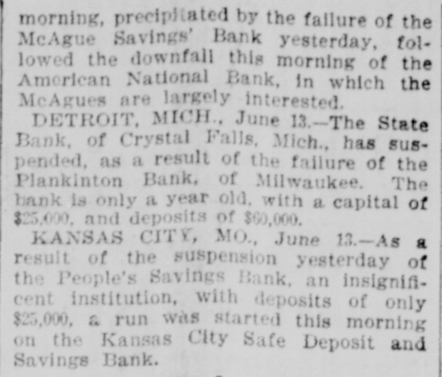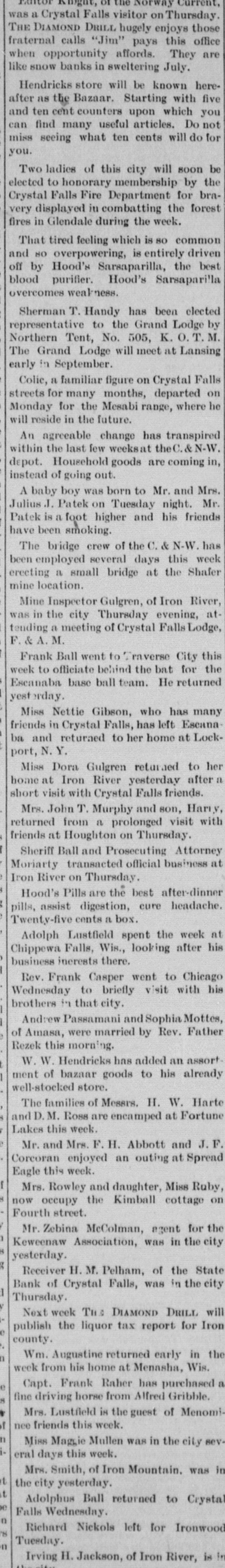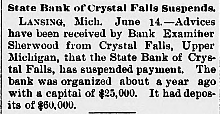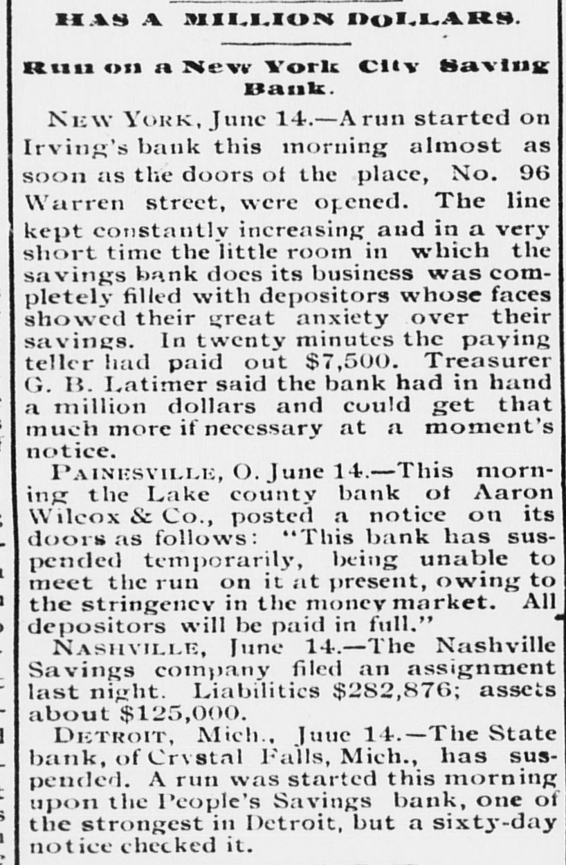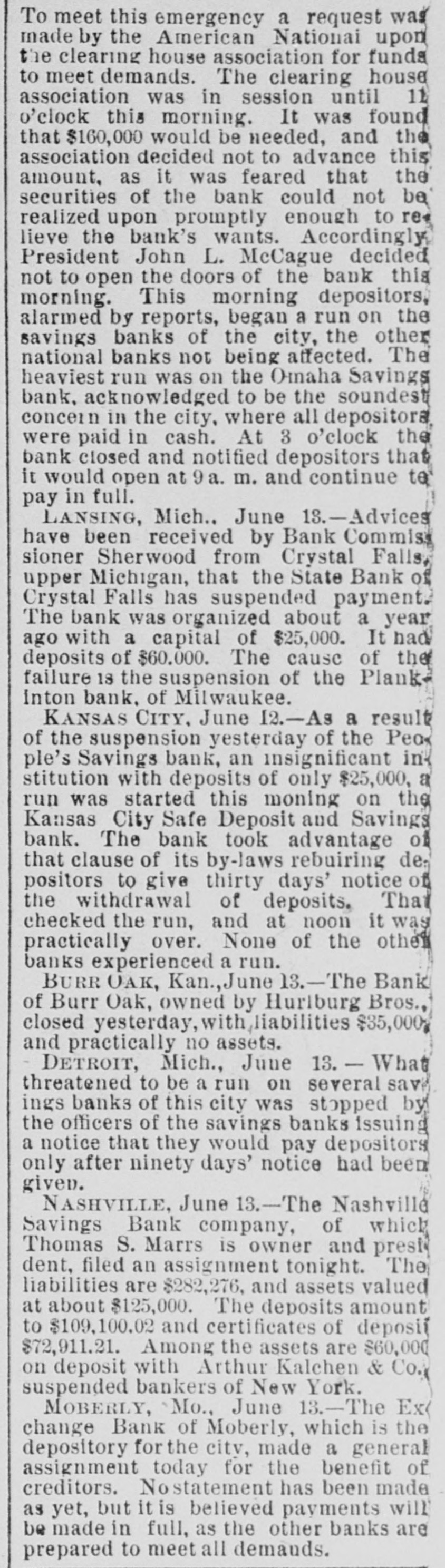 TELEGRAPHIC BREVITIES. The State Bank of Crystal Falls, Mich., has suspended payment. S.G. Love, a lineman of a St. Louis electric light company, was roasted to death while at work yesterday evening on a pole. Seven more deaths occured yesterday from the choleraic disease that is prevailing at the town of Alais, in southern France. This is a total of 16 deaths for two days this week. There was a run on every savings bank in Omaha this morning, precitated by the failure of the McCague Savings Bank yesterday followed by the downfall this morning of the American National Bank, in which the McCagues are largely interested. Frank Dillingham sneaked into the house of Mrs. Wolcott, in New York this morning and stole a lot of jewelry valued at $1,600, but his noise attracted the attention of Miss Wolcott and her mother, who seized Dillingham, when he threw away his plunder and escaped. He was subsequently caught by an officer. The jewelry was recovered. Excitement was caused inJeremia and Jacmel a few days ago by a false report that Manigat had landed in Hayti with a large following and was marching towards Port au Prince, but the prompt action of the commandants of both towns mentioned prevented any uprising. It is reported that Gens. Morales and Manigat have come to some understanding and it is likely that a joint attempt will be made to overthrow Heureaux, of San Domingo, and Hyppolyte, of Hayti. In the Borden trial at New Bedford, Mass., to-day Dr. Dolan said that the blows were made by a sharp instrument and some on Mrs. Bordon by an assailant astride the body. Dr. Wood stated that examination showed no blood on the claw-hammered hatchet or axe or on the blue dress. The hair found on this hatchet was not human. The white skirt showed a small blood spot which probably came from outside and was human blood. The shoes and stockings and dining room door casing had no blood spots. The handieless hatchet had no blood. The break in its handle had no dust. The handleless hatchet had dust like ashes on the blade tightly adhering. While Mrs. Patterson's sixteen-year-old son was cleaning his rifle at Morava, Iowa, to-day it was accidentally discharged, the bullet piercing his mother's heart, causing inst nt death. Young Patterson had to be restrained from committing suicide, so great was his grief. The mangled body of Gustave Koenig. a well known young business man of St. Joseph, Mo., was found beside the railroad tracks yesterday morning. He had been murdered and robbed, after which the body was laid on the track to cover up the cause of death, George Williams, colored, charged with an assault on 2n eight-year-old negro girl near Waco, Tex., was captured yesterday by negroes who say Williams afterward escaped. It is believed the negroes lynched Williams. The fight between Billy Woods, of Coloraand "Buffalo" Costello, of Australia, at