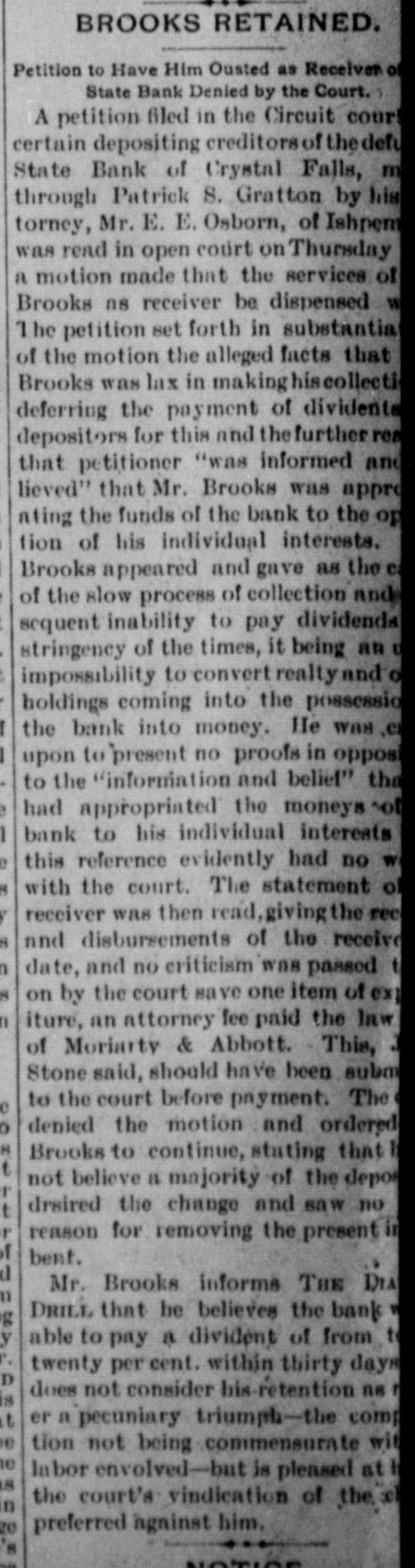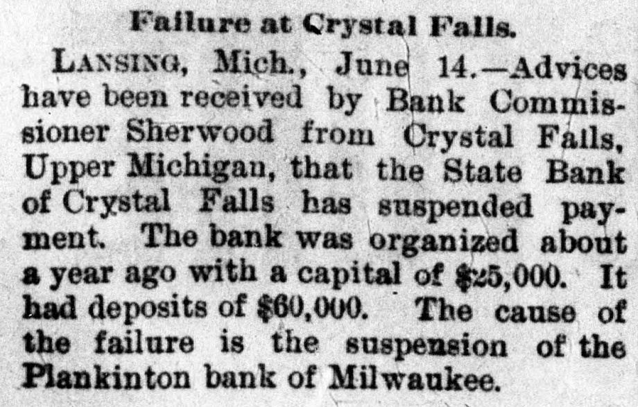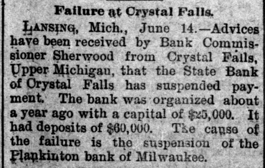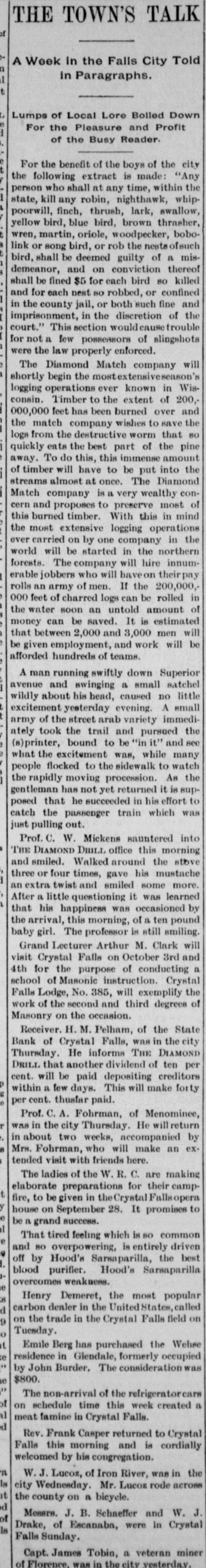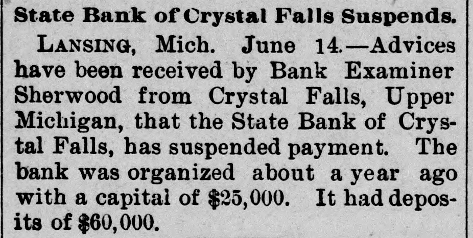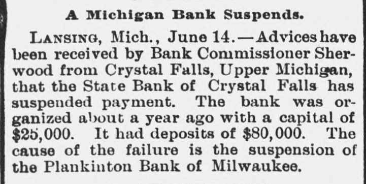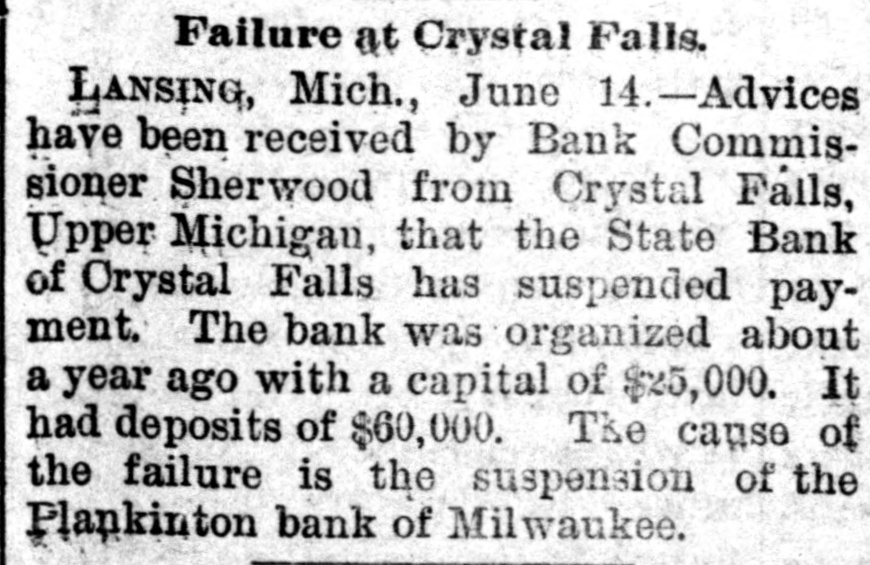 TELEGRAPHIC BREVITIES. The State Bank of Crystal Falls, Mich., has suspended payment. S.G. Love, a lineman of a St. Louis electric light company, was roasted to death while at work yesterday evening on a pole. Seven more deaths occured yesterday from the choleraic disease that is prevailing at the town of Alais, in southern France. This is a total of 16 deaths for two days this week. There was a run on every savings bank in Omaha this morning, precitated by the failure of the McCague Savings Bank yesterday followed by the downfall this morning of the American National Bank, in which the McCagues are largely interested. Frank Dillingham sneaked into the house of Mrs. Wolcott, in New York this morning and stole a lot of jewelry valued at $1,600, but his noise attracted the attention of Miss Wolcott and her mother, who seized Dillingham, when he threw away his plunder and escaped. He was subsequently caught by an officer. The jewelry was recovered. Excitement was caused inJeremia and Jacmel a few days ago by a false report that Manigat had landed in Hayti with a large following and was marching towards Port au Prince, but the prompt action of the commandants of both towns mentioned prevented any uprising. It is reported that Gens. Morales and Manigat have come to some understanding and it is likely that a joint attempt will be made to overthrow Heureaux, of San Domingo, and Hyppolyte, of Hayti. In the Borden trial at New Bedford, Mass., to-day Dr. Dolan said that the blows were made by a sharp instrument and some on Mrs. Bordon by an assailant astride the body. Dr. Wood stated that examination showed no blood on the claw-hammered hatchet or axe or on the blue dress. The hair found on this hatchet was not human. The white skirt showed a small blood spot which probably came from outside and was human blood. The shoes and stockings and dining room door casing had no blood spots. The handieless hatchet had no blood. The break in its handle had no dust. The handleless hatchet had dust like ashes on the blade tightly adhering. While Mrs. Patterson's sixteen-year-old son was cleaning his rifle at Morava, Iowa, to-day it was accidentally discharged, the bullet piercing his mother's heart, causing inst nt death. Young Patterson had to be restrained from committing suicide, so great was his grief. The mangled body of Gustave Koenig. a well known young business man of St. Joseph, Mo., was found beside the railroad tracks yesterday morning. He had been murdered and robbed, after which the body was laid on the track to cover up the cause of death, George Williams, colored, charged with an assault on 2n eight-year-old negro girl near Waco, Tex., was captured yesterday by negroes who say Williams afterward escaped. It is believed the negroes lynched Williams. The fight between Billy Woods, of Coloraand "Buffalo" Costello, of Australia, at