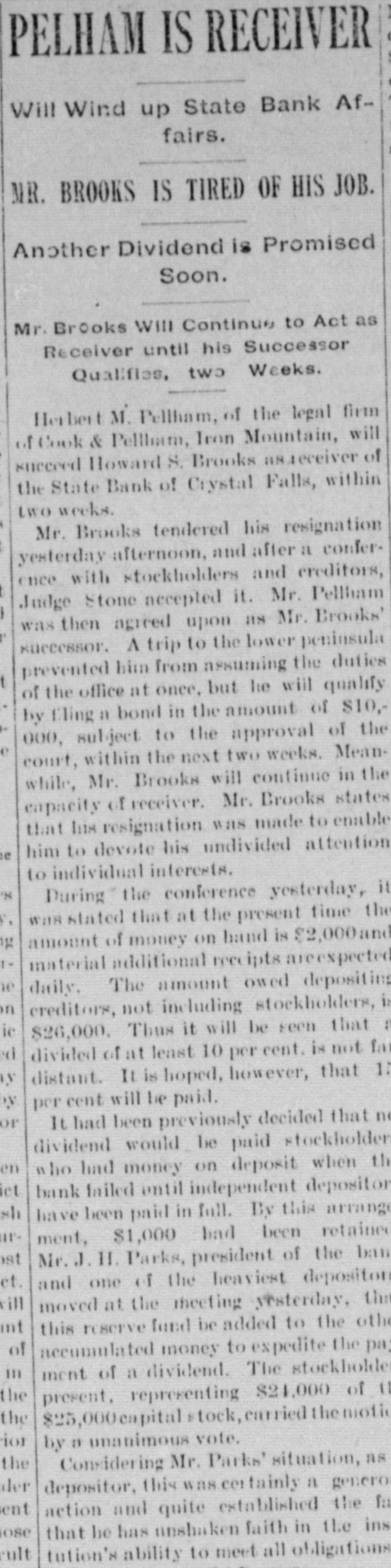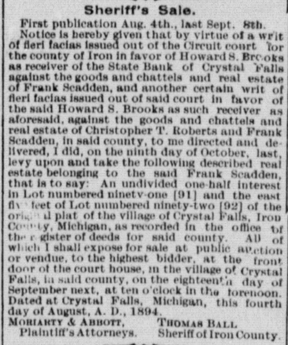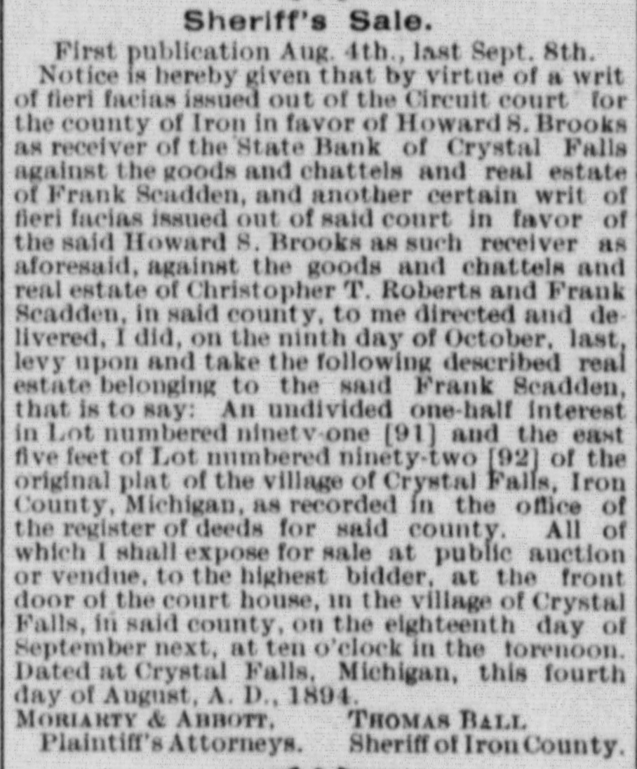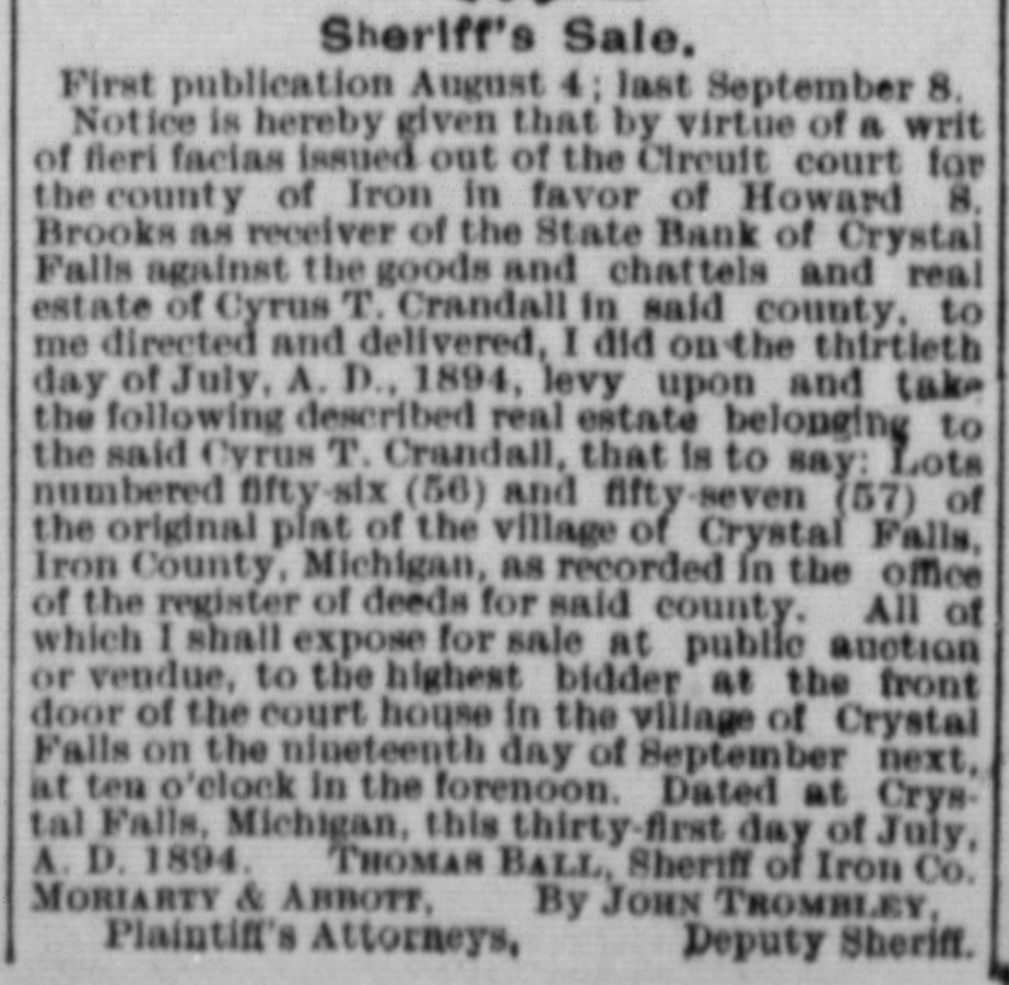 TELEGRAPHIC BREVITIES. The State Bank of Crystal Falls, Mich., has suspended payment. S.G. Love, a lineman of a St. Louis electric light company, was roasted to death while at work yesterday evening on a pole. Seven more deaths occured yesterday from the choleraic disease that is prevailing at the town of Alais, in southern France. This is a total of 16 deaths for two days this week. There was a run on every savings bank in Omaha this morning, precitated by the failure of the McCague Savings Bank yesterday followed by the downfall this morning of the American National Bank, in which the McCagues are largely interested. Frank Dillingham sneaked into the house of Mrs. Wolcott, in New York this morning and stole a lot of jewelry valued at $1,600, but his noise attracted the attention of Miss Wolcott and her mother, who seized Dillingham, when he threw away his plunder and escaped. He was subsequently caught by an officer. The jewelry was recovered. Excitement was caused inJeremia and Jacmel a few days ago by a false report that Manigat had landed in Hayti with a large following and was marching towards Port au Prince, but the prompt action of the commandants of both towns mentioned prevented any uprising. It is reported that Gens. Morales and Manigat have come to some understanding and it is likely that a joint attempt will be made to overthrow Heureaux, of San Domingo, and Hyppolyte, of Hayti. In the Borden trial at New Bedford, Mass., to-day Dr. Dolan said that the blows were made by a sharp instrument and some on Mrs. Bordon by an assailant astride the body. Dr. Wood stated that examination showed no blood on the claw-hammered hatchet or axe or on the blue dress. The hair found on this hatchet was not human. The white skirt showed a small blood spot which probably came from outside and was human blood. The shoes and stockings and dining room door casing had no blood spots. The handieless hatchet had no blood. The break in its handle had no dust. The handleless hatchet had dust like ashes on the blade tightly adhering. While Mrs. Patterson's sixteen-year-old son was cleaning his rifle at Morava, Iowa, to-day it was accidentally discharged, the bullet piercing his mother's heart, causing inst nt death. Young Patterson had to be restrained from committing suicide, so great was his grief. The mangled body of Gustave Koenig. a well known young business man of St. Joseph, Mo., was found beside the railroad tracks yesterday morning. He had been murdered and robbed, after which the body was laid on the track to cover up the cause of death, George Williams, colored, charged with an assault on 2n eight-year-old negro girl near Waco, Tex., was captured yesterday by negroes who say Williams afterward escaped. It is believed the negroes lynched Williams. The fight between Billy Woods, of Coloraand "Buffalo" Costello, of Australia, at